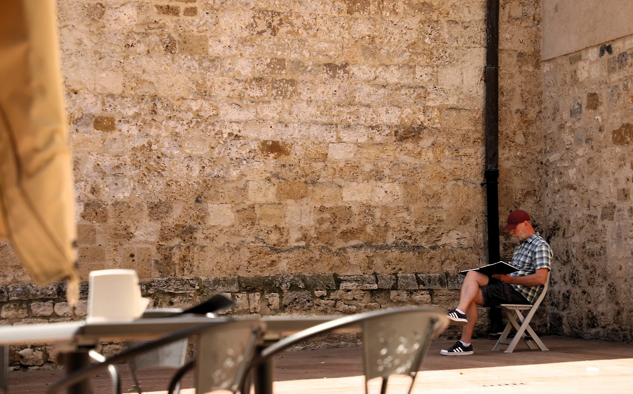 메뉴를 보는 커플, 스케치하는 남자, 같은 방향을 바라보는 사람, 흐뭇한 표정으로 사진을 찍는 사람, 누군가와 통화를 하는 여인, 악기를 조율하며 버스킹을 준비하는 남자...