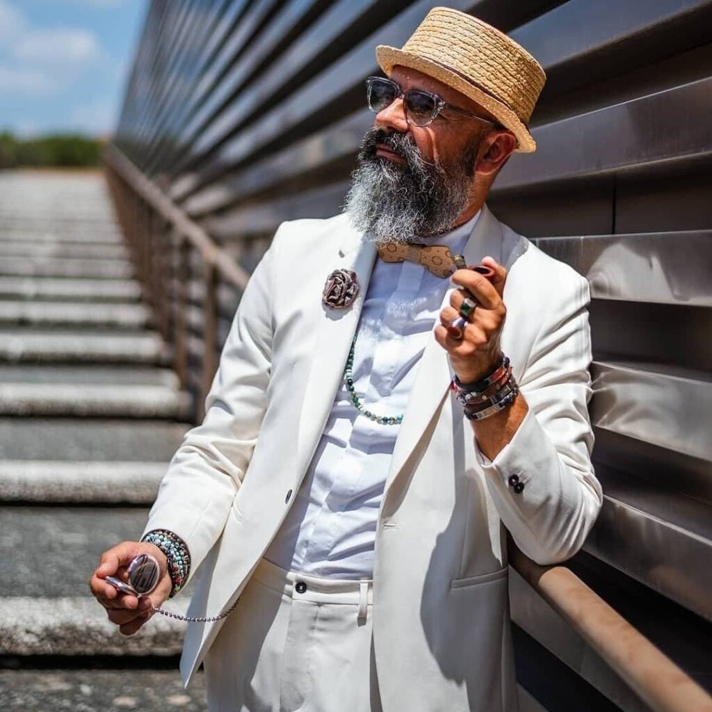 공들여 손질한 수염, 바람에 흩날리는 무성하고 긴 남자의 머리카락, 과감한 디자인의 구두를 찰떡같이 소화하는 모습에서 패션은 역시 자신감에서 완성되는 게 아닌가 싶다.