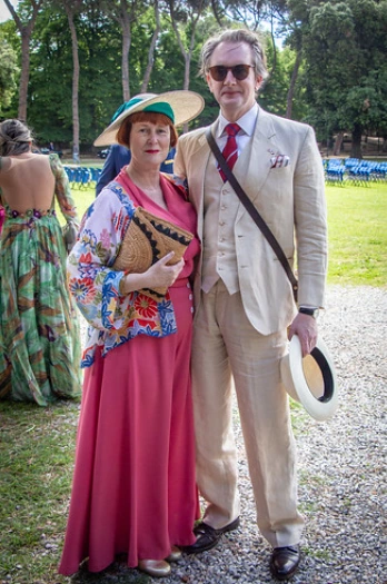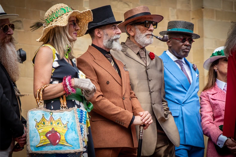 얼굴보다 더 긴 원통형에 챙이 달린 톱햇, 보라색 블레이저, 레이스로 만든 양산, 영국 왕실 여인들이 쓸법한 납작한 모자 등 일반적인 차림이 아니다.