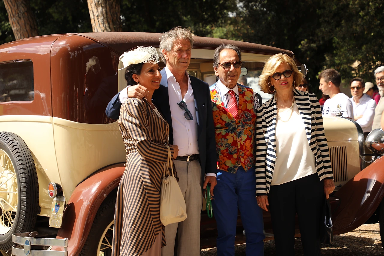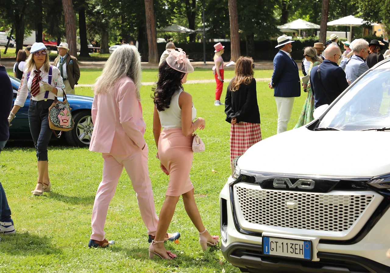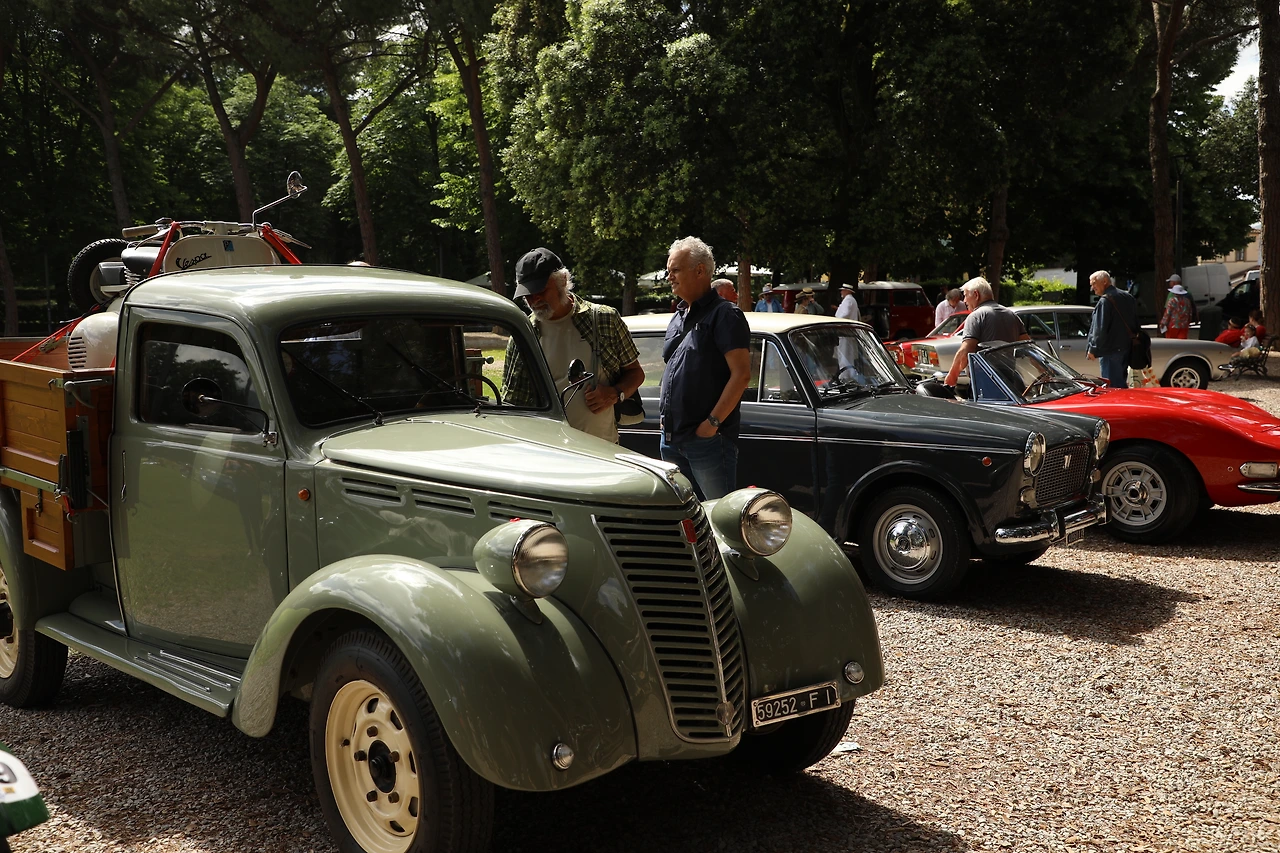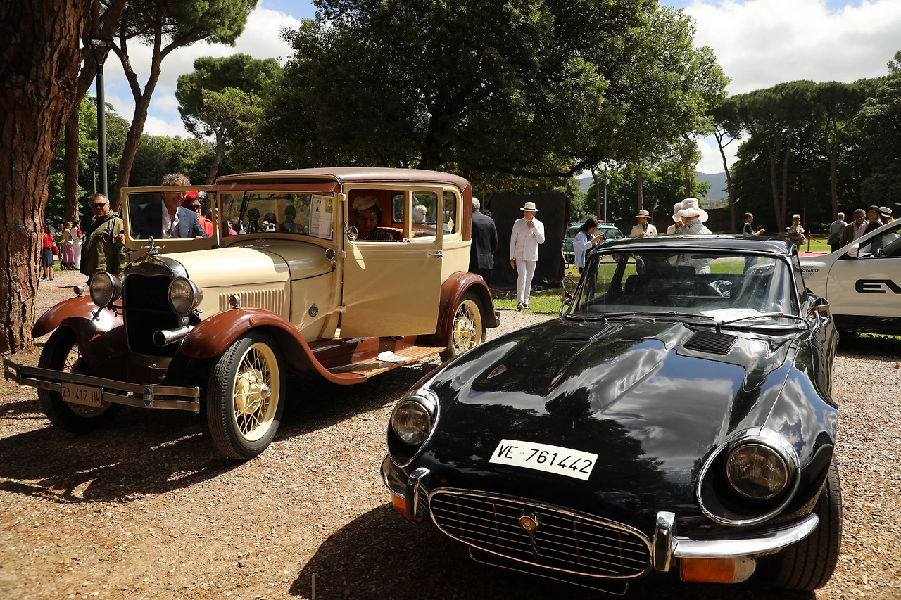 놀랍게도 앙증맞은 빈티지 자동차들이 줄지어 들어오며 잔디 위에 줄지어 세우고 있다.