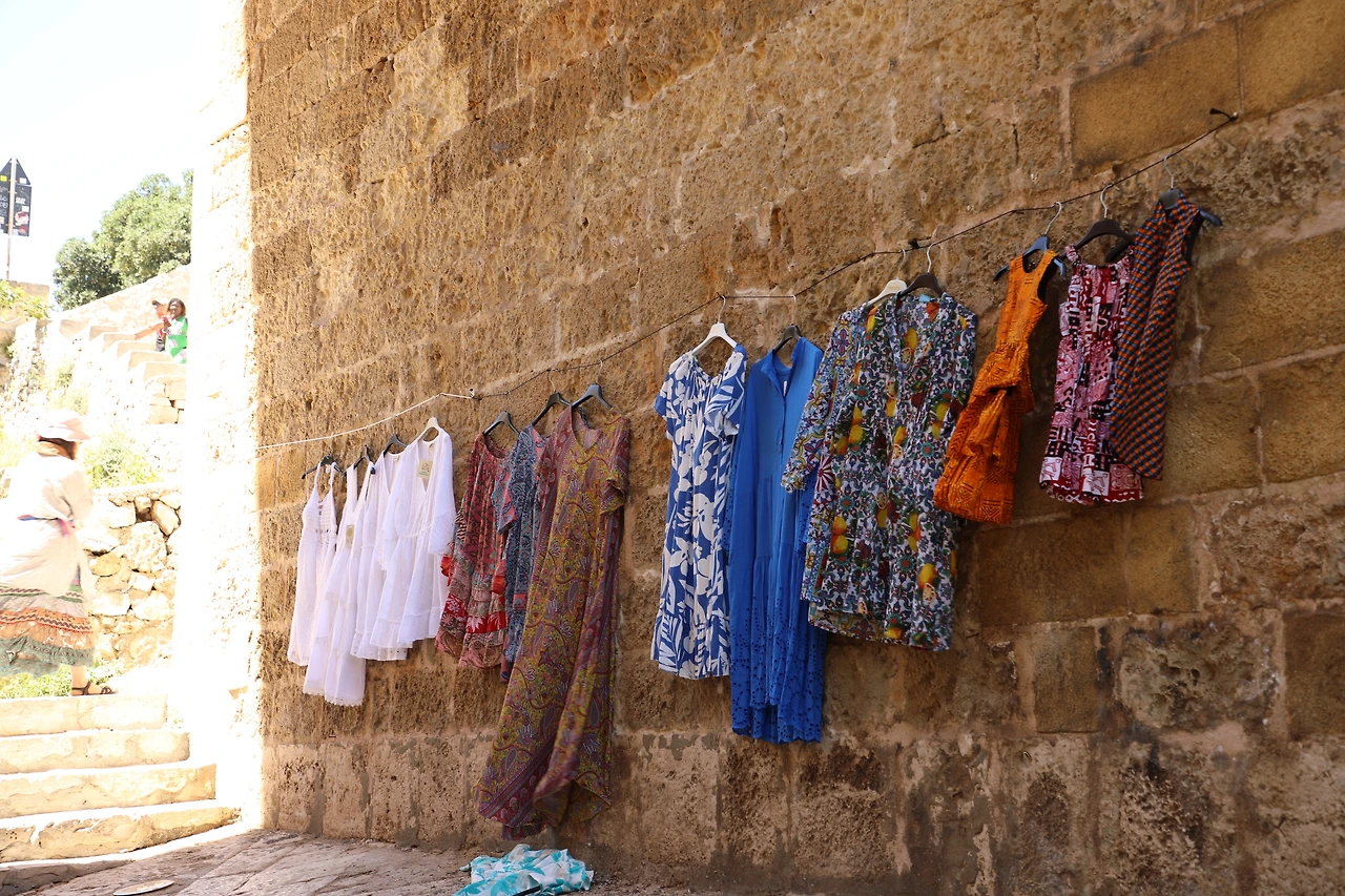 해변으로 향하는 돌담에는 알록달록한 비치웨어들이 걸려있다.