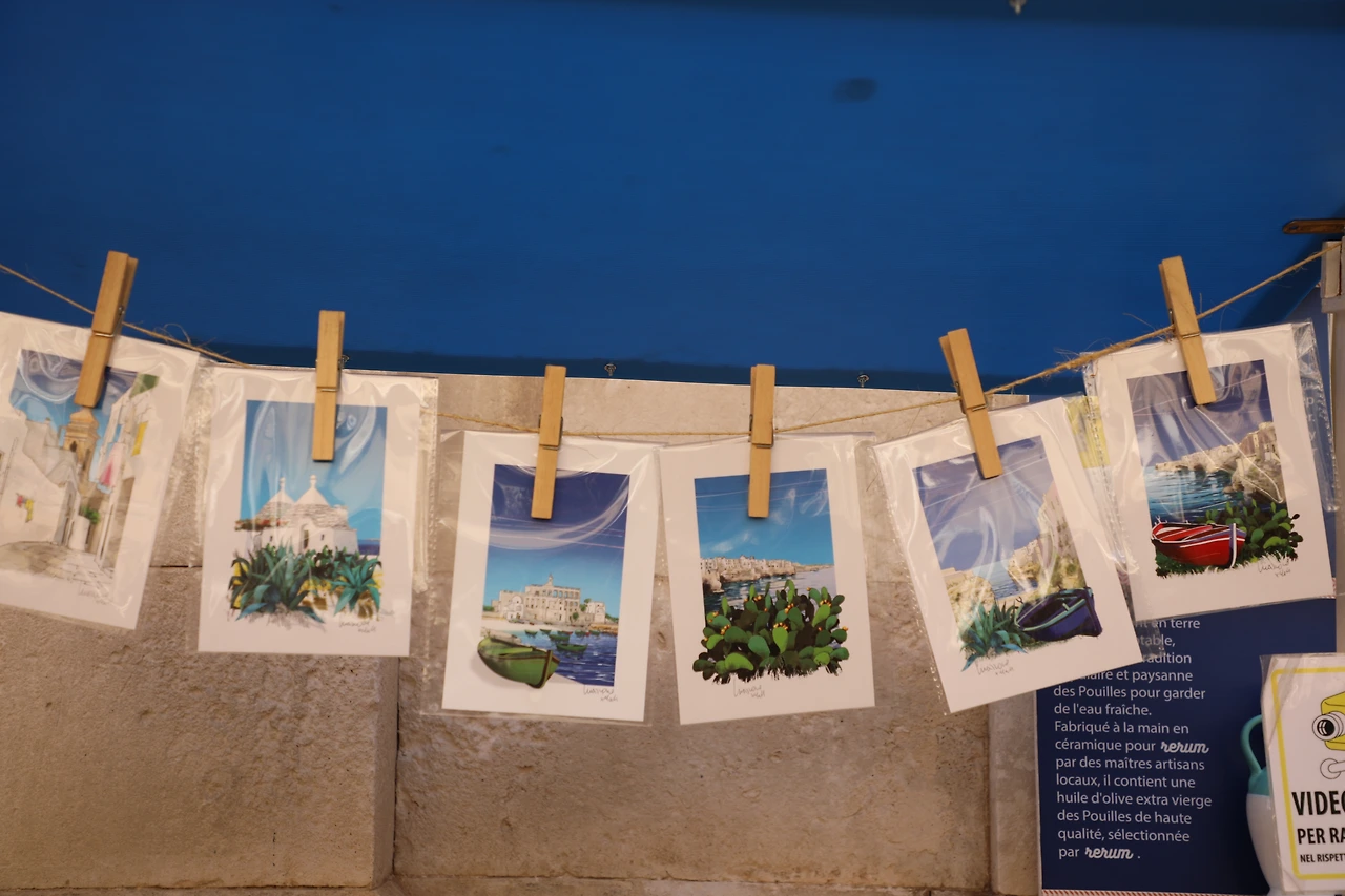 파란색을 배경으로 집게로 걸어둔 그림엽서들이 모여 또 다른 한 장의 엽서가 되고 있었다.