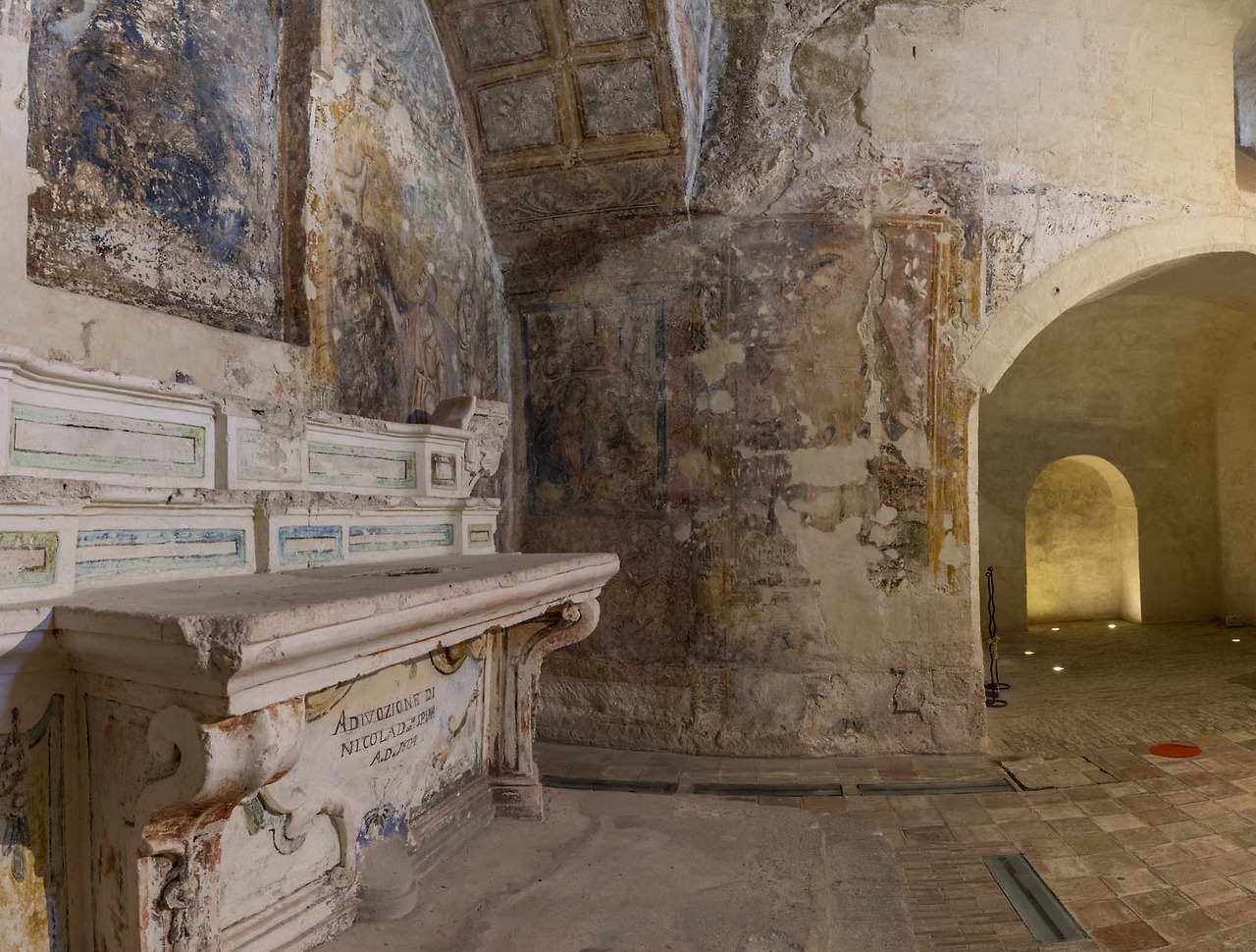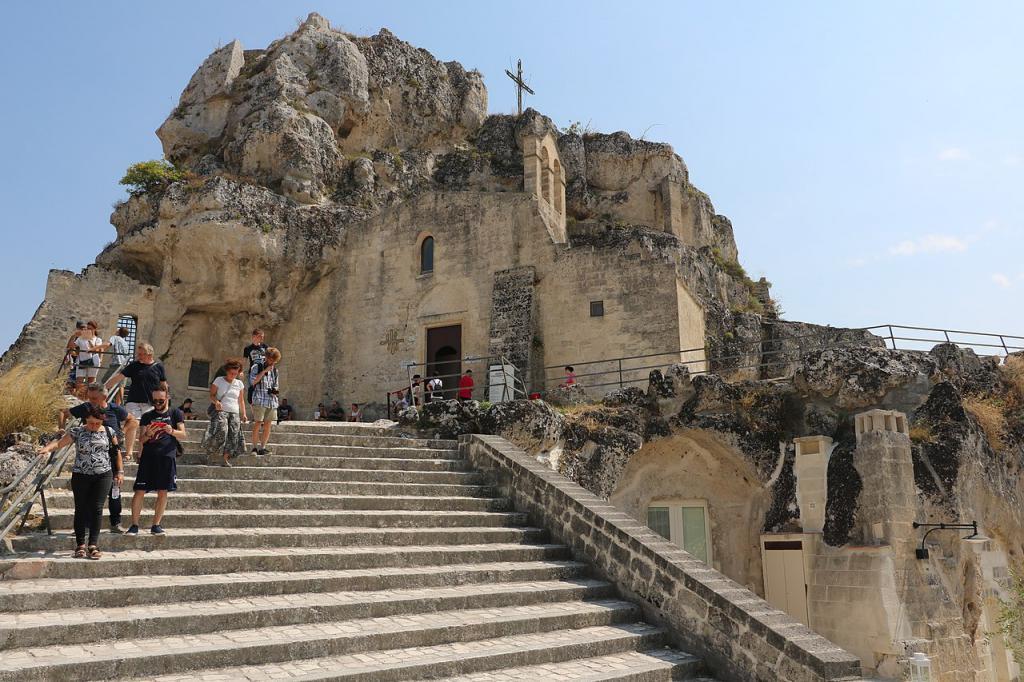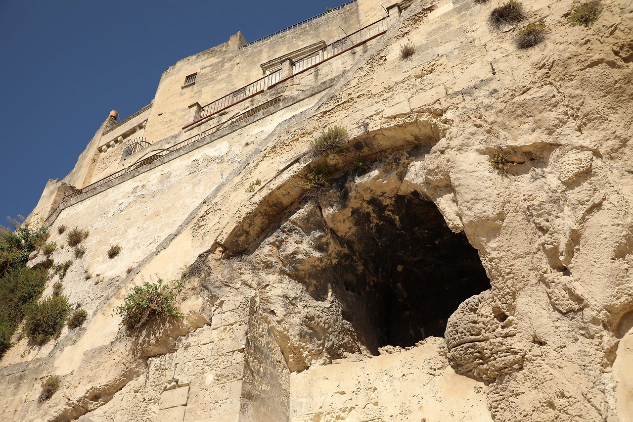 전망대 정면으로 동굴 유적지가 있는 협곡 건너편에 평평한 공간이 눈에 띄는데 그것은 동굴성당 (Chiesa di Santa Maria di Idris)이다.