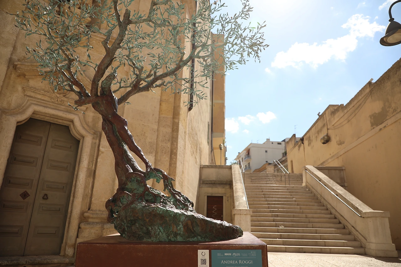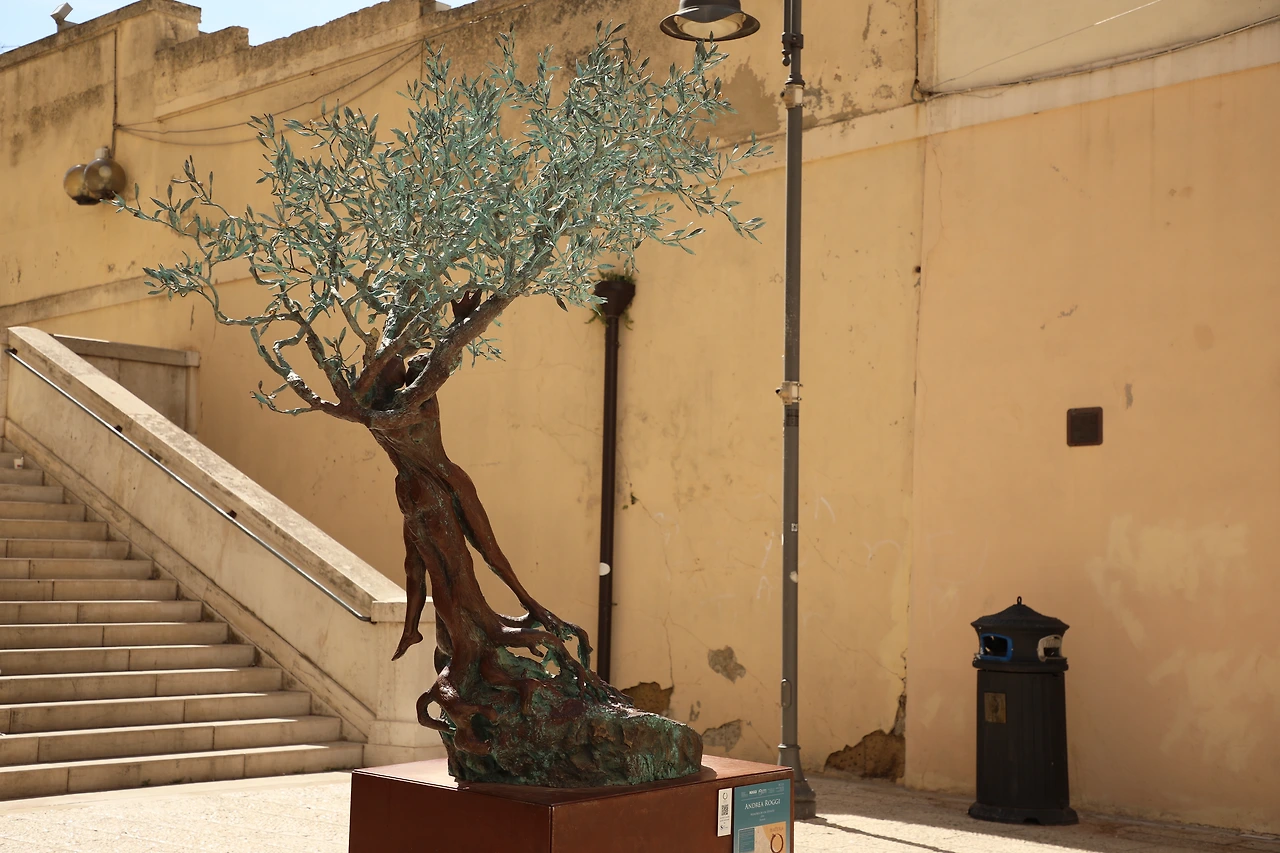 나무의 둥치 부분은 남녀 한쌍이 부둥켜안고 있는 형상이고 뻗어나간 가지에는 올리브 나무 이파리가 달려있는 청동 작품, 생명의 나무(Tree of Life)이다.