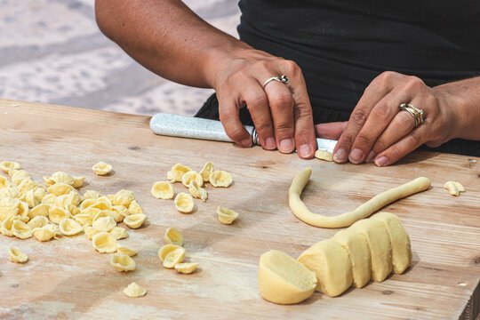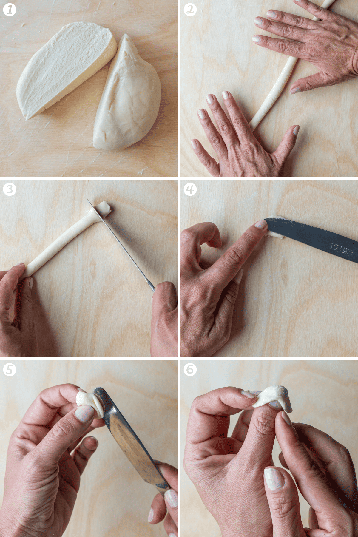 세몰리나 가루에 실온의 물을 섞어 반죽한 후 긴 밧줄 모양으로 만든 다음 나이프로 잘게 자른 후 엄지 손가락으로 오목한 모양을 내면 된다.