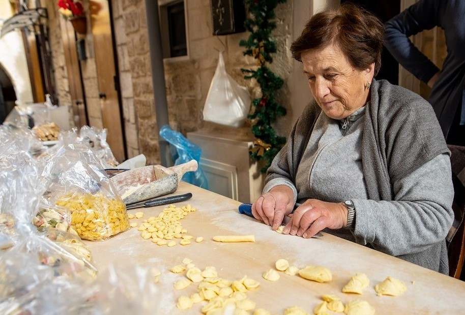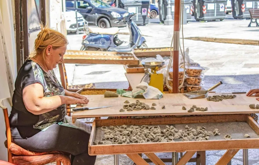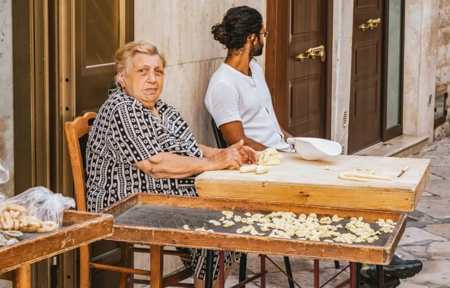 50대 아주머니부터 70대 할머니들이 길거리 나무 테이블 앞에 앉아 두런두런 이갸기를 나누며 숙련된 손길로 파스타를 만들고 있다.