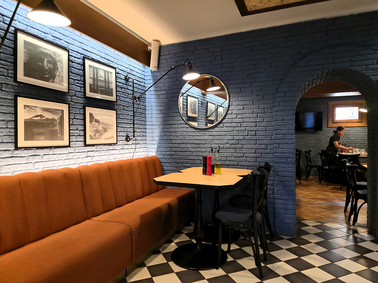 센스 있는 웨이트리스가 한쪽 공간의 조용한 좌석으로 안내했어요.