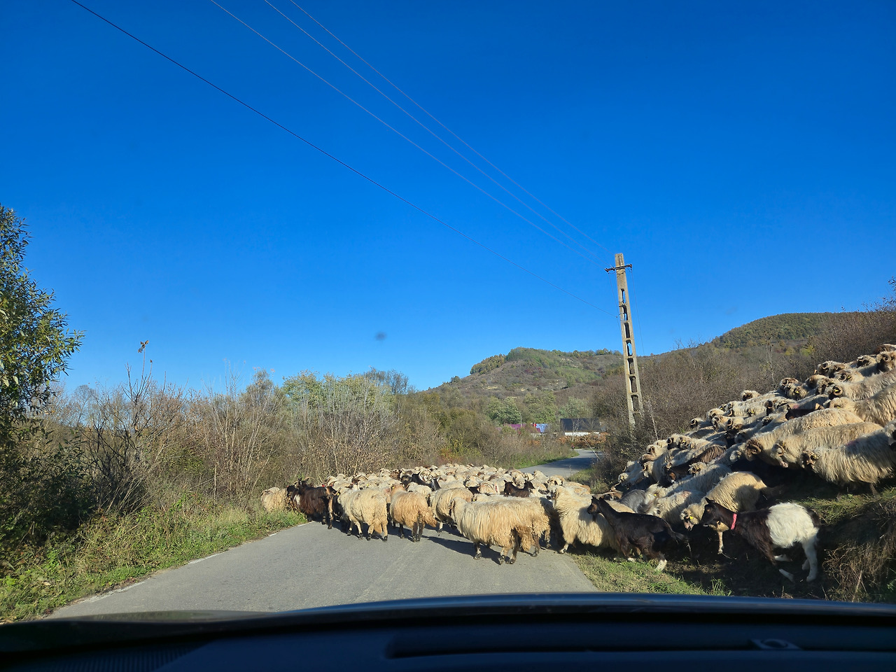 꼬불꼬불한 1차선 산길에 접어들었는데 양들이 도로를 가로질러가는 모습이 보였지요.