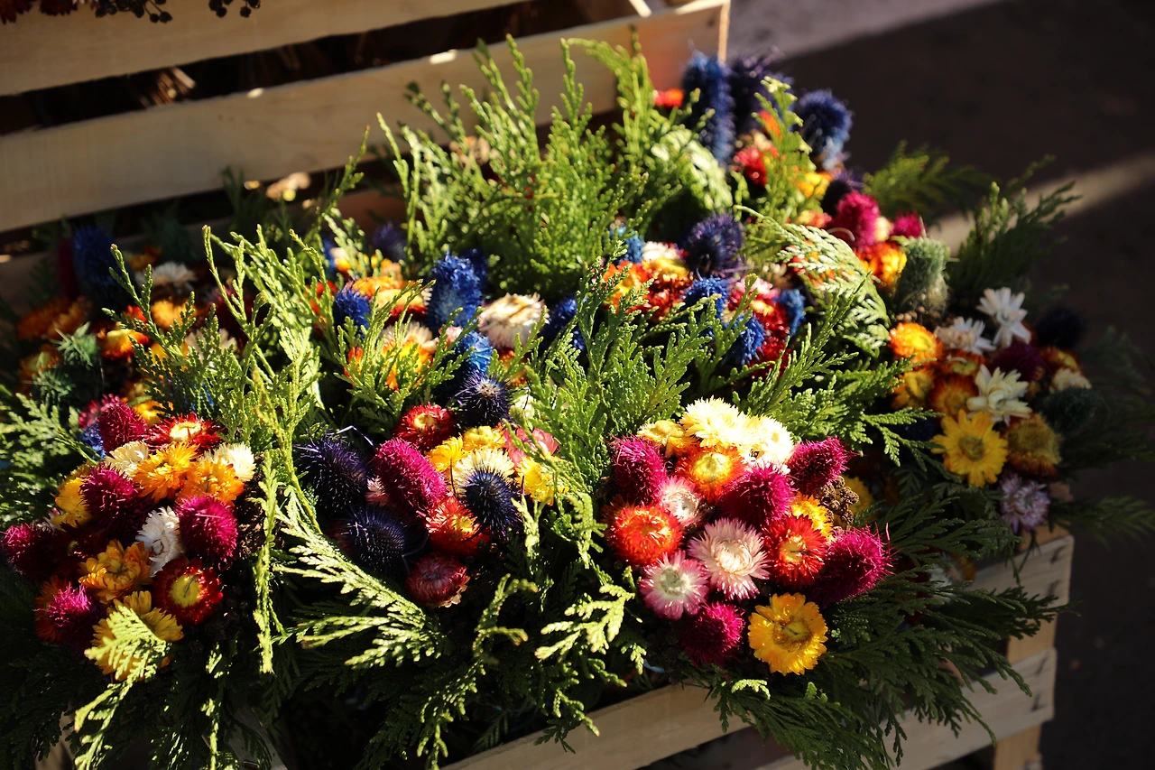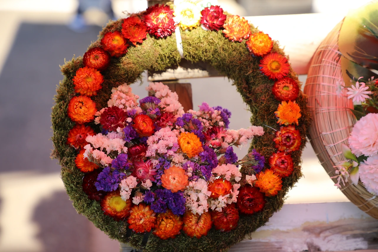 조화로 만든 리스 장식도 있고 말린 꽂으로 만든 작은 꽃다발도 있었습니다.