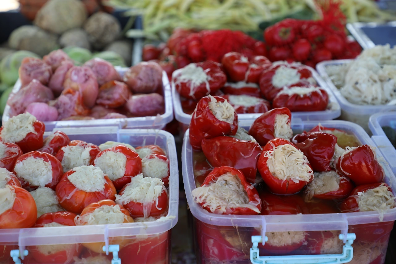 파프리카 속에 채 썬 양파를 넣은 반찬은 아마도 김치 같은 게 아닐까 싶습니다.