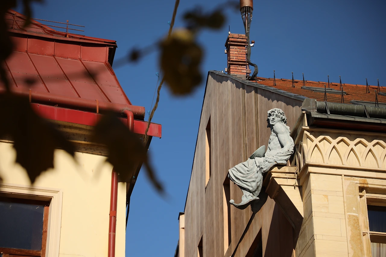 맞은 편의 노란색 건물은 오페라 극장인 루시안 블라가 국립극장입니다.