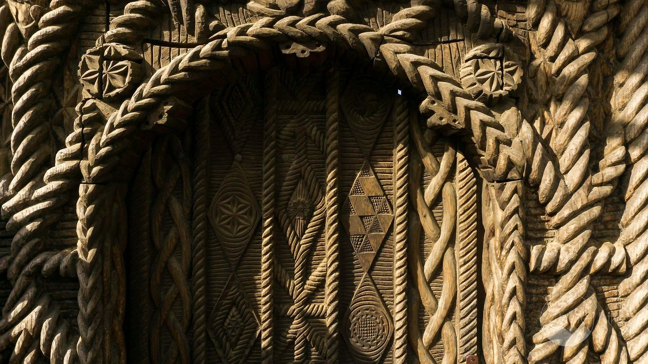 그것은 마을 입구에 세워놓은 나무조각의 전통 문입니다.