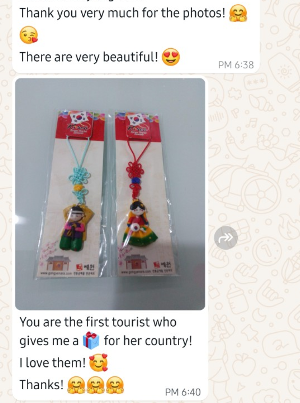 그녀는 여행자에게서 처음으로 받은 선물이라며 우리가 준 전통매듭 고리 사진을 답장으로 보내왔습니다.