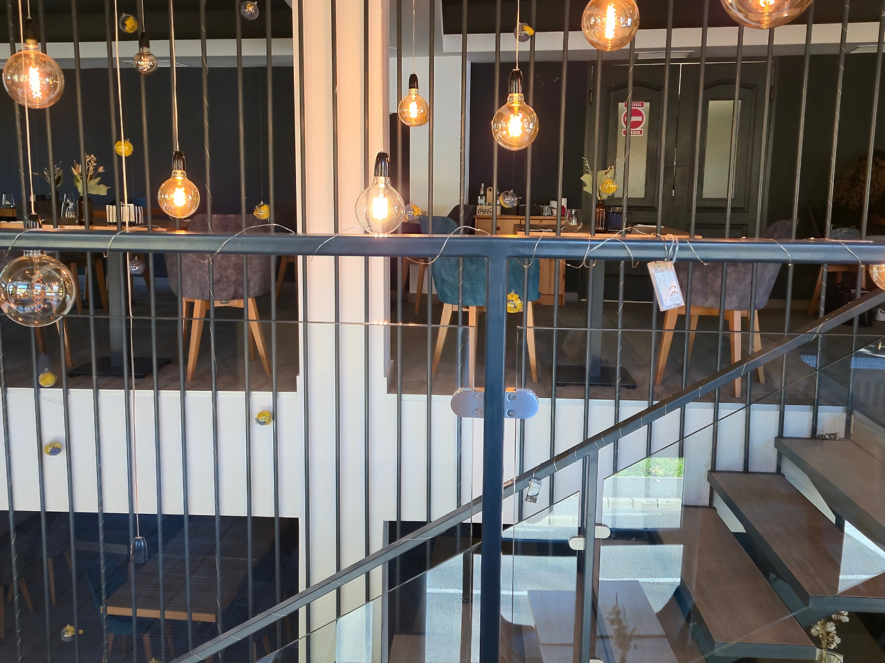 길쭉한 원통형의 하얀 조명들이 줄을 타고 길게 매달려 있어 깊이의 효과를 극대화시켰습니다.
