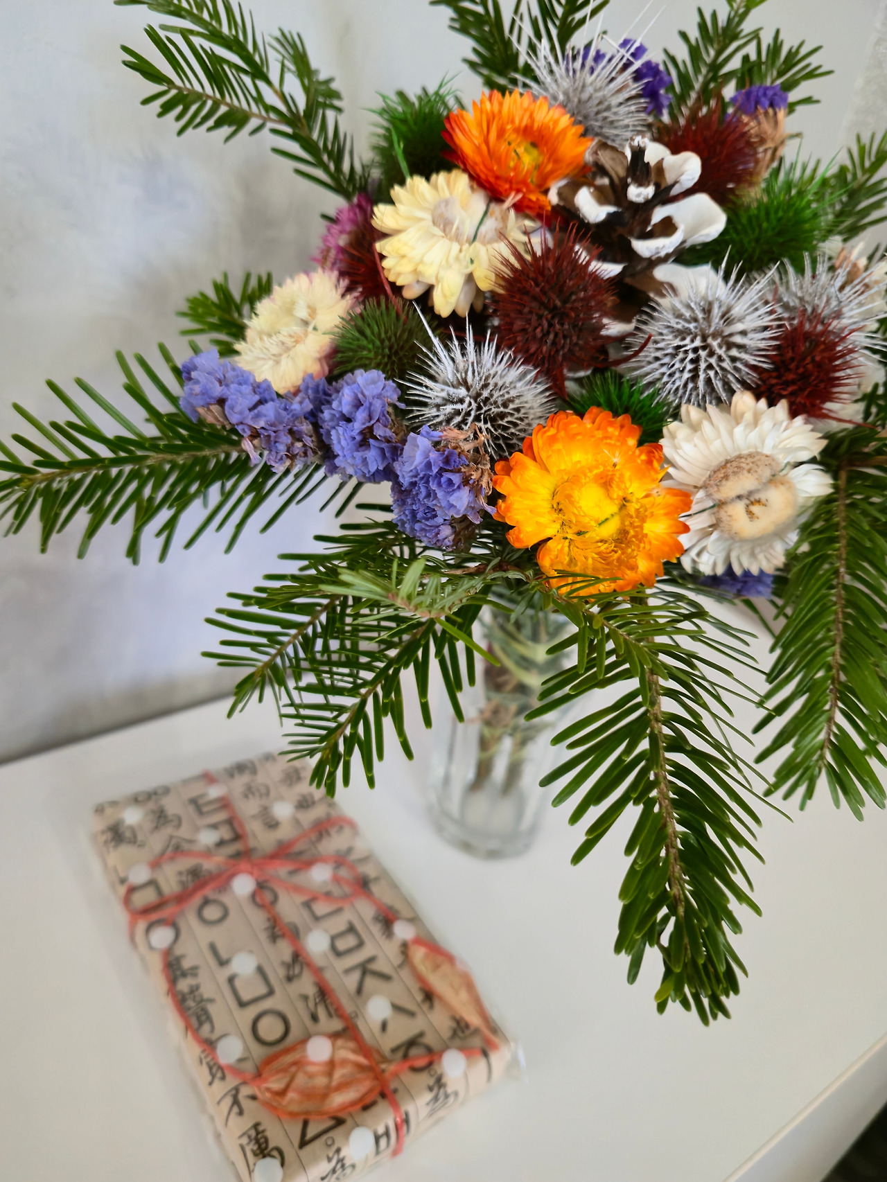 시장에서 할머니에게 샀던 꽃과 손거울을 나란히 놓고 사진을 찍어 호스트에게 보냅니다.