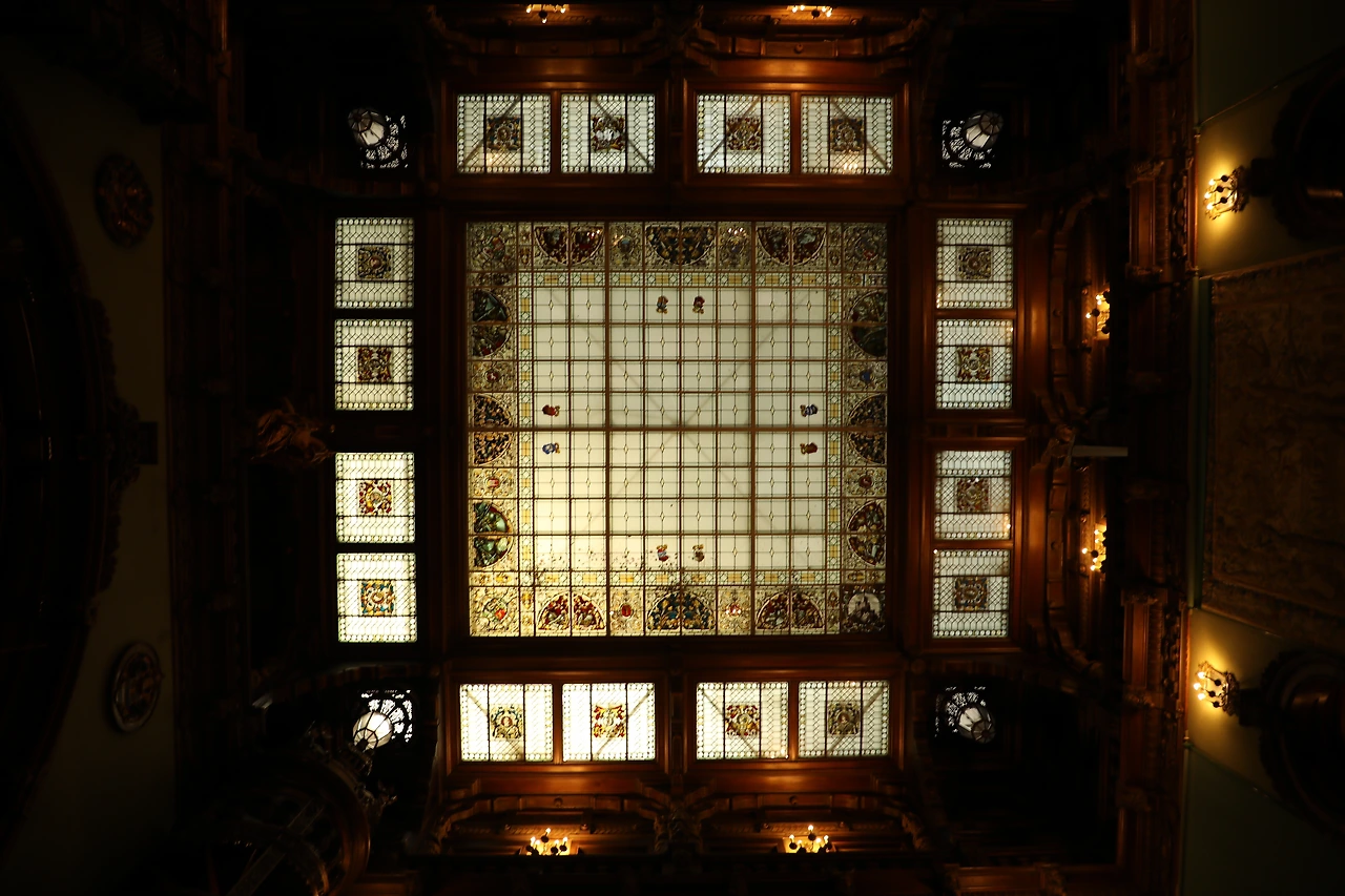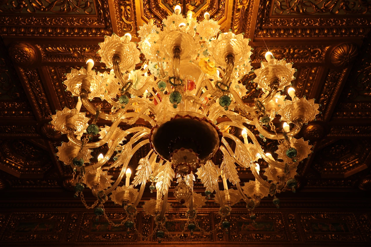 다른 궁전에서 흔히 볼 수 있는 크리스털 샹들리에가 아니라 채색 유리로 만든 것입니다.
