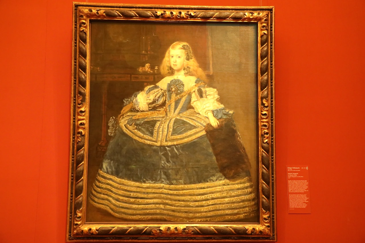 파란색 드레스를 입은 인판타 마르가리타 테레사(9세)는 1659년에 그려졌고 벨라스케스의 가장 유명한 초상화 중 하나입니다.
