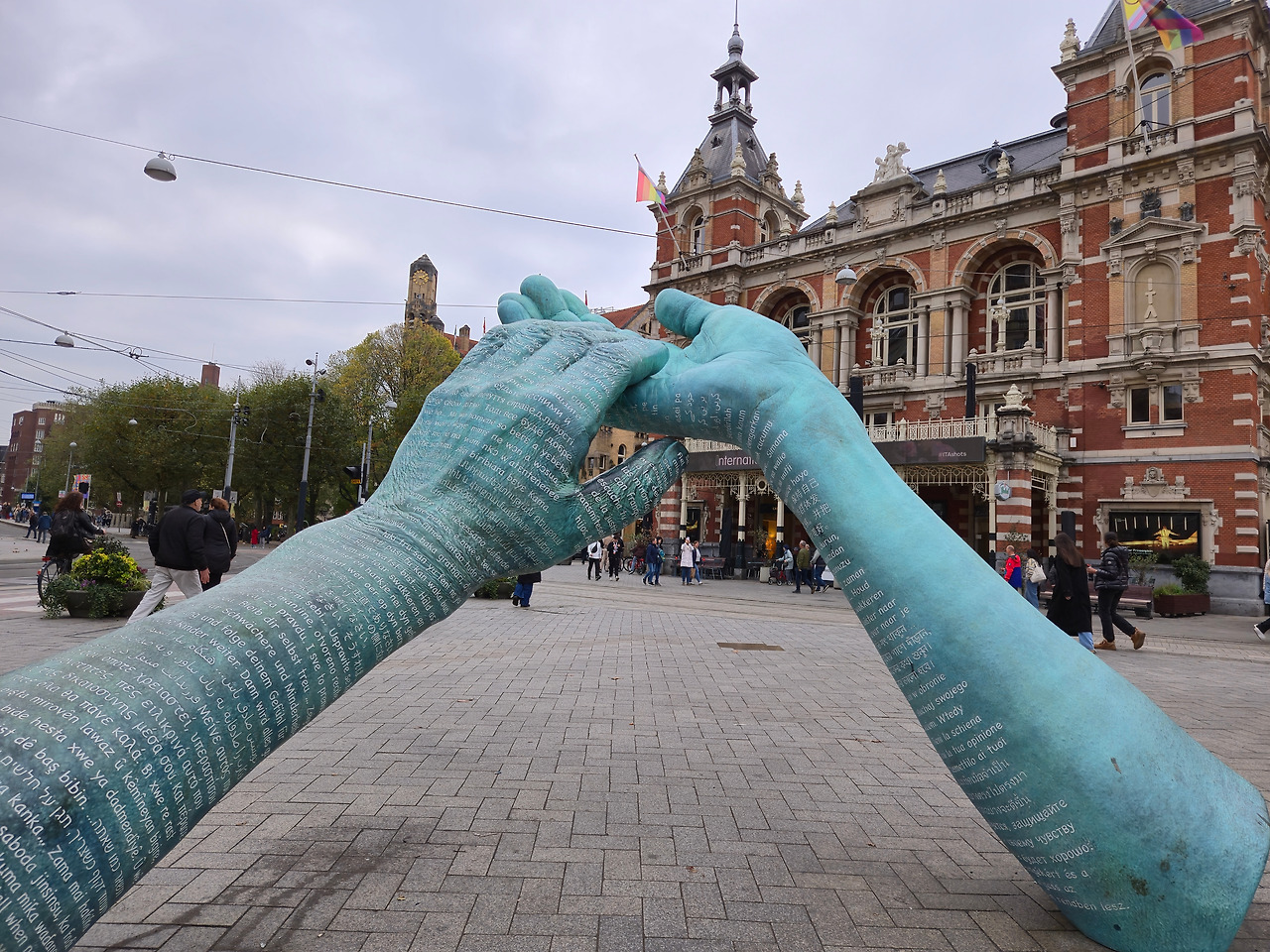 광장에 서로 잡고 있는 두 개의 청동 손 조각이 있습니다.