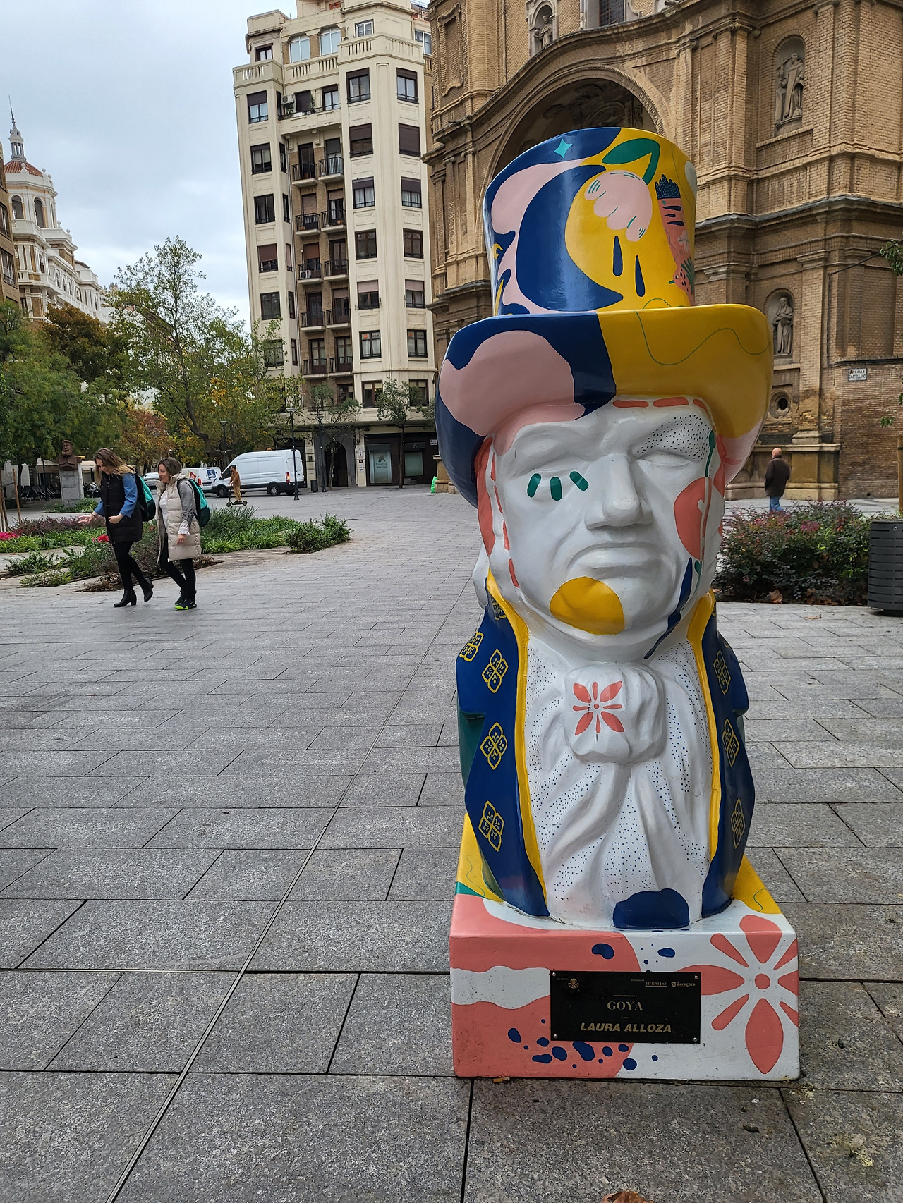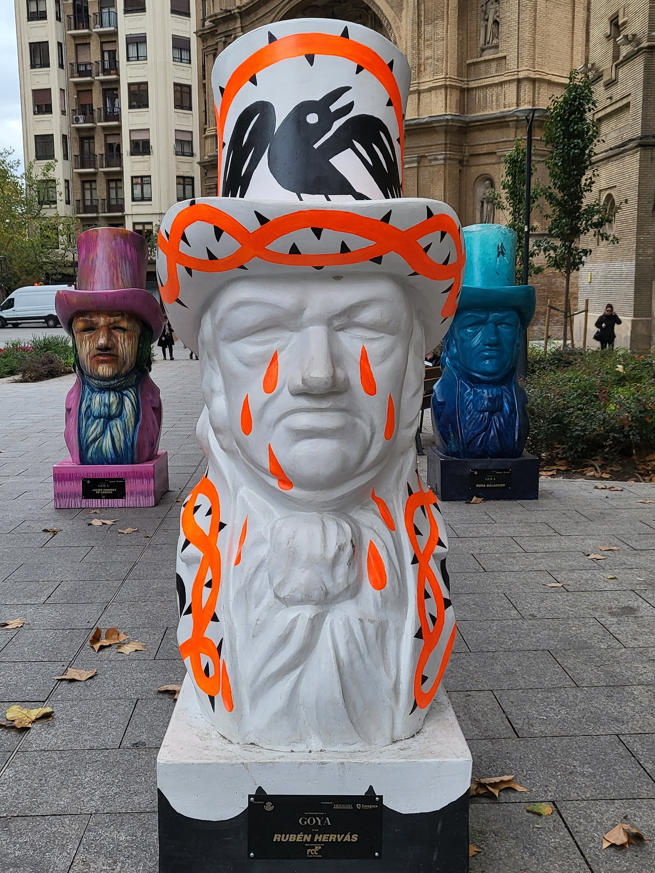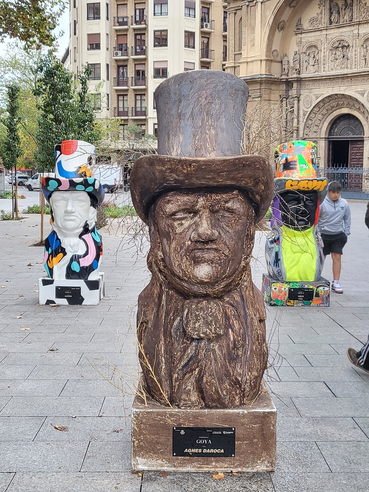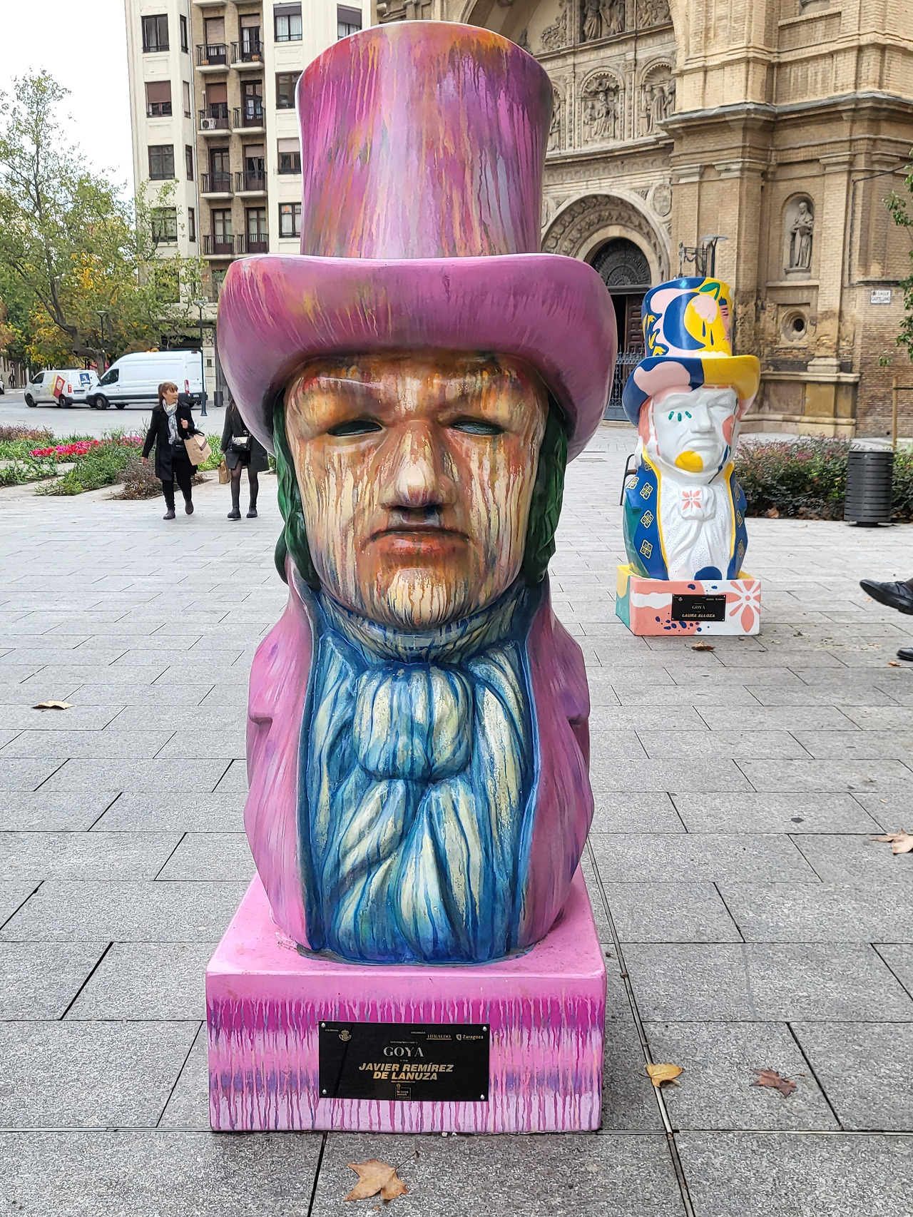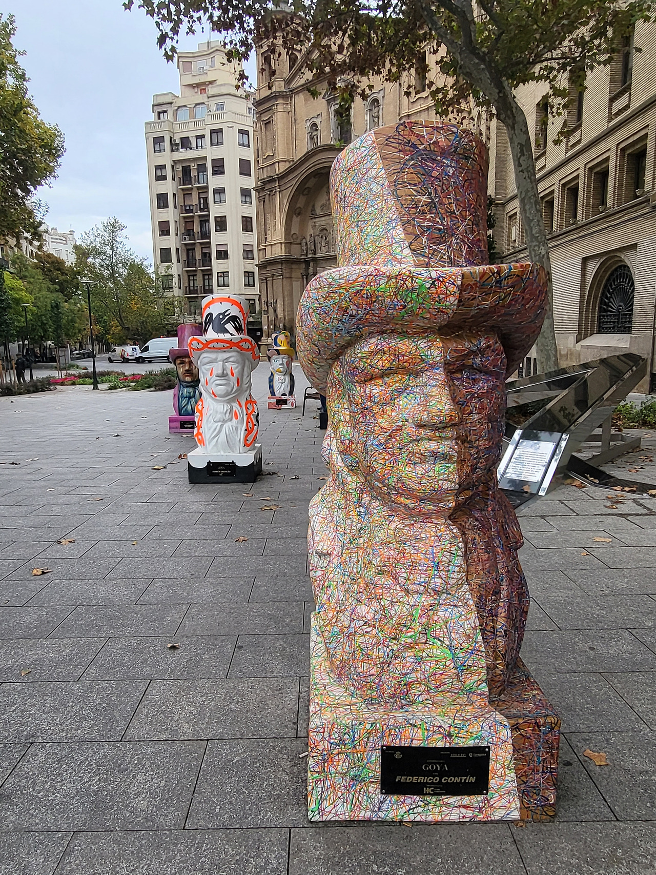 지지 부분에는 금속 보강재를 넣어 200kg이나 되는 이 조각은 고야 미술관에 소장된 고야의 자화상을 모티브로 만들어 아라곤 출신의 예술가 12명이 각각 페인팅 작업으로 만든 것입니다.