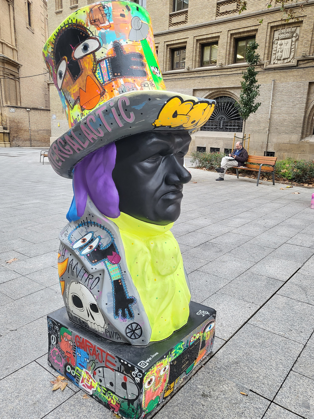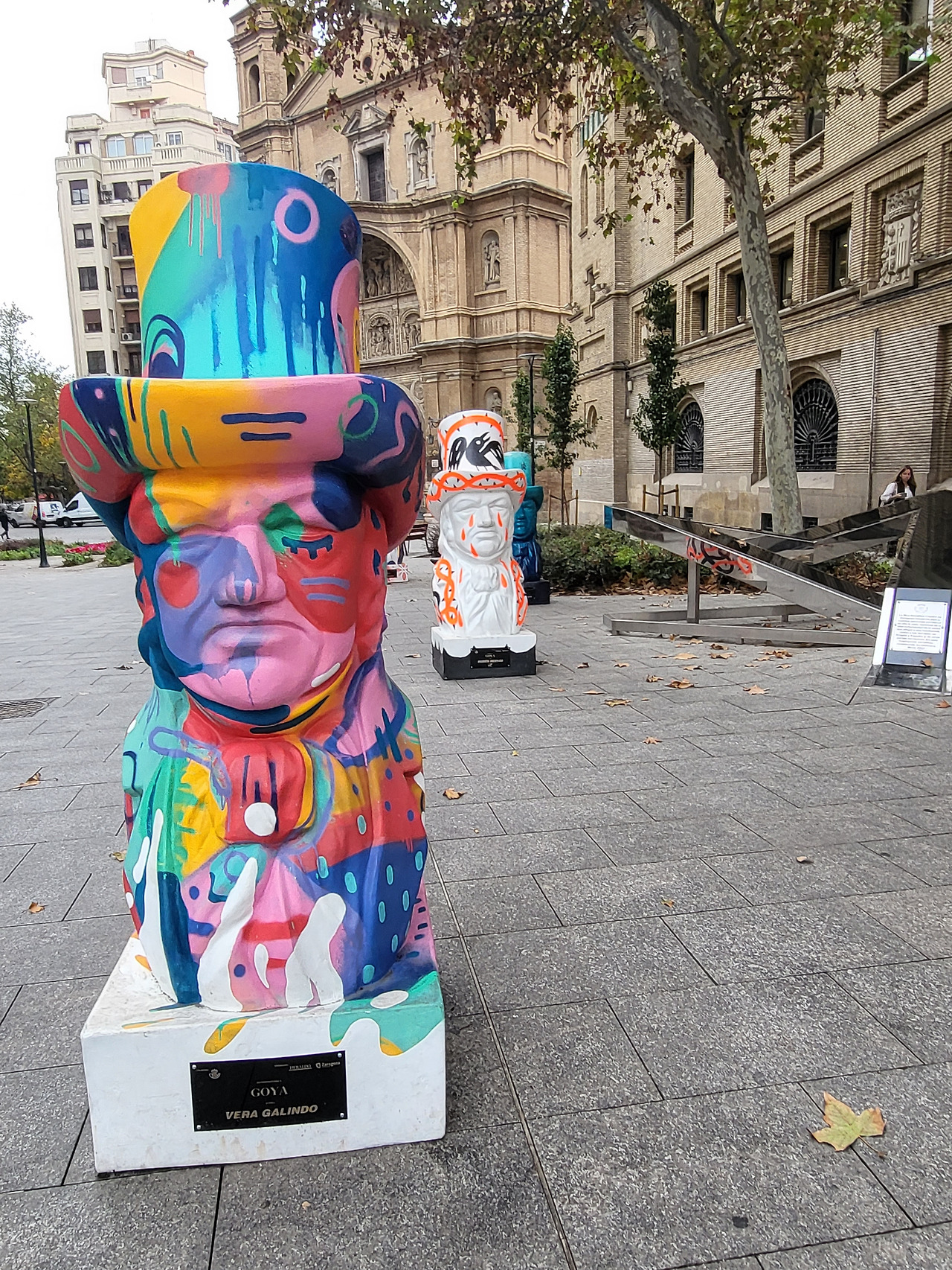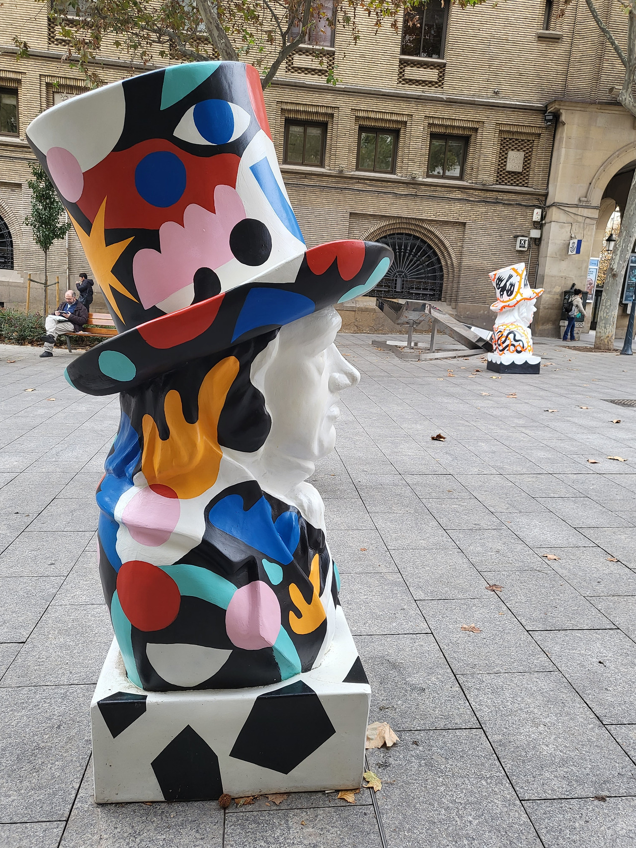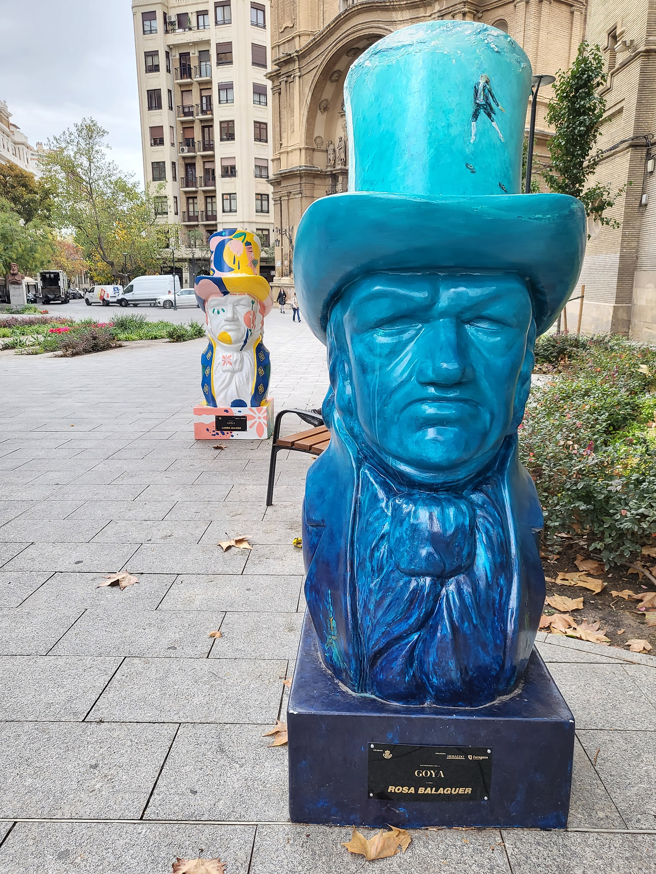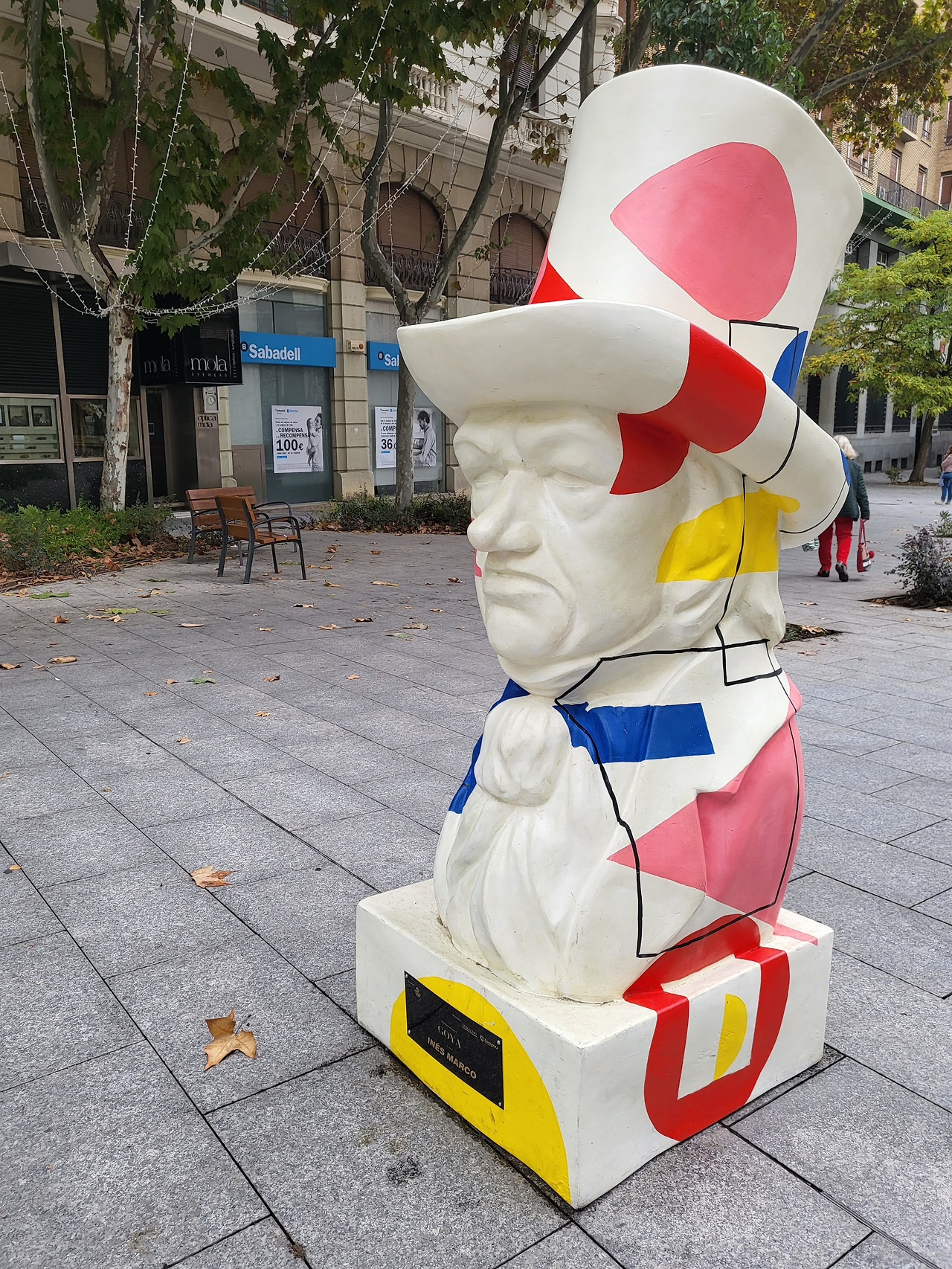 지지 부분에는 금속 보강재를 넣어 200kg이나 되는 이 조각은 고야 미술관에 소장된 고야의 자화상을 모티브로 만들어 아라곤 출신의 예술가 12명이 각각 페인팅 작업으로 만든 것입니다.