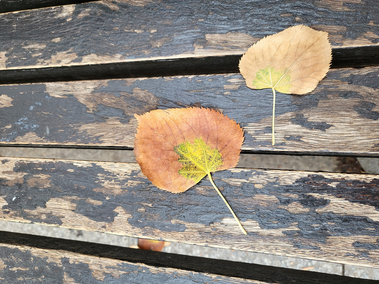 가운데 초록색 잎맥이 혈관처럼 그대로 남아있고 가장자리만 누렇게 변한 낙엽들이 떨어져 있는 길거리 벤치에 앉았지요.