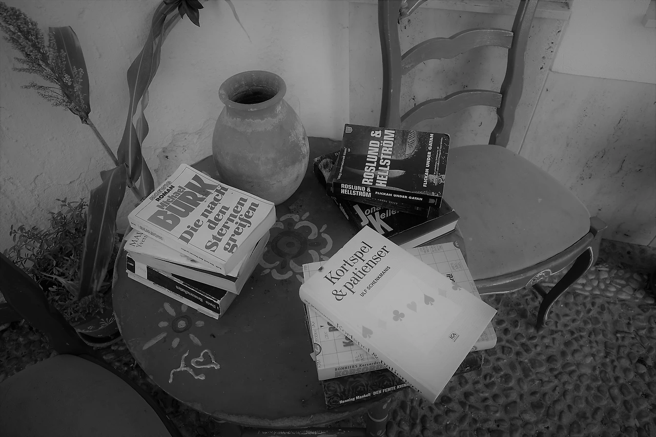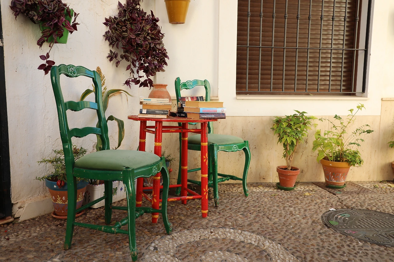 녹색 나무 의자 두 개와 빨간색 동그란 테이블 위에는 제법 낡은 책들이 수북이 쌓여 있습니다.