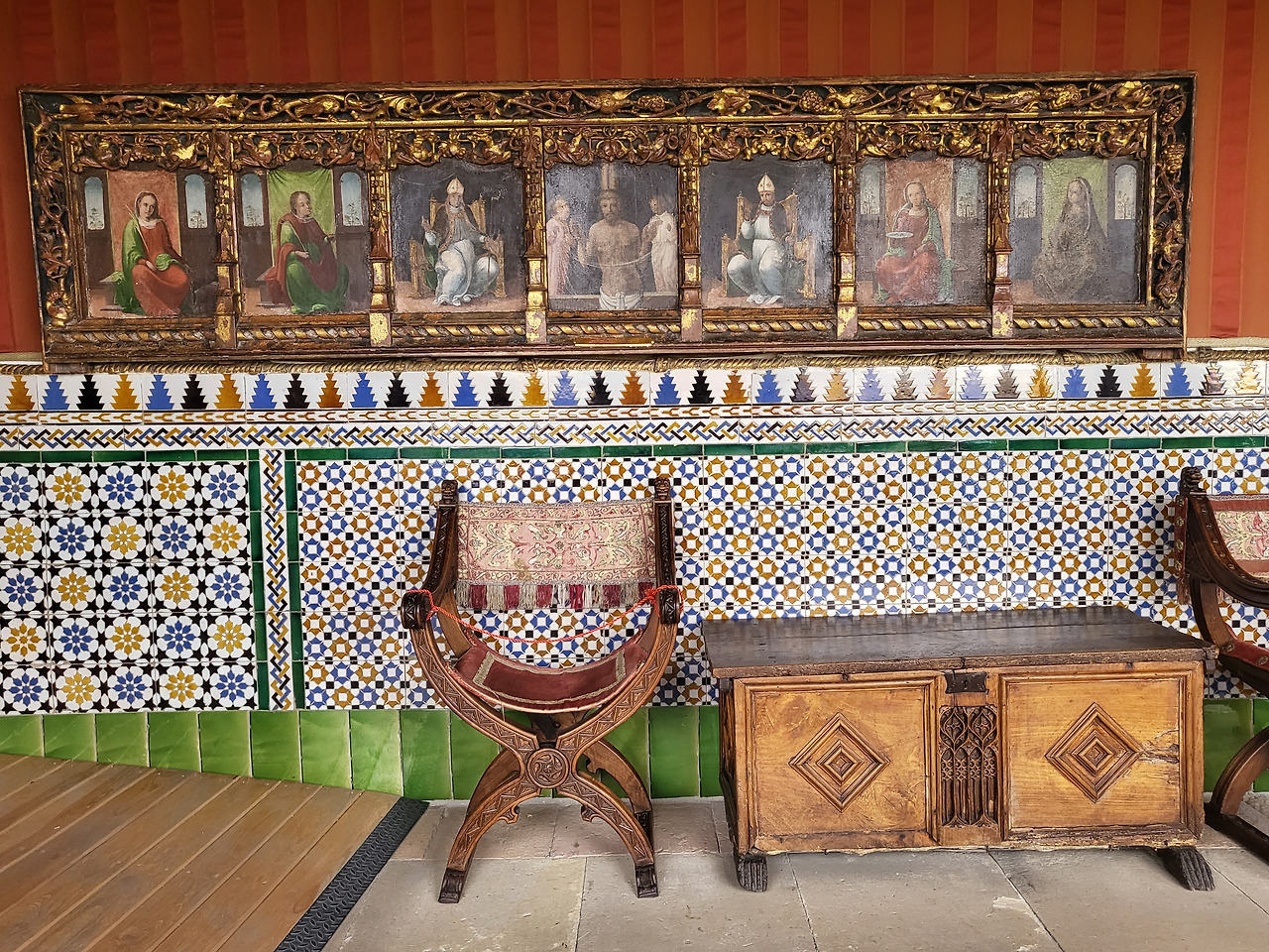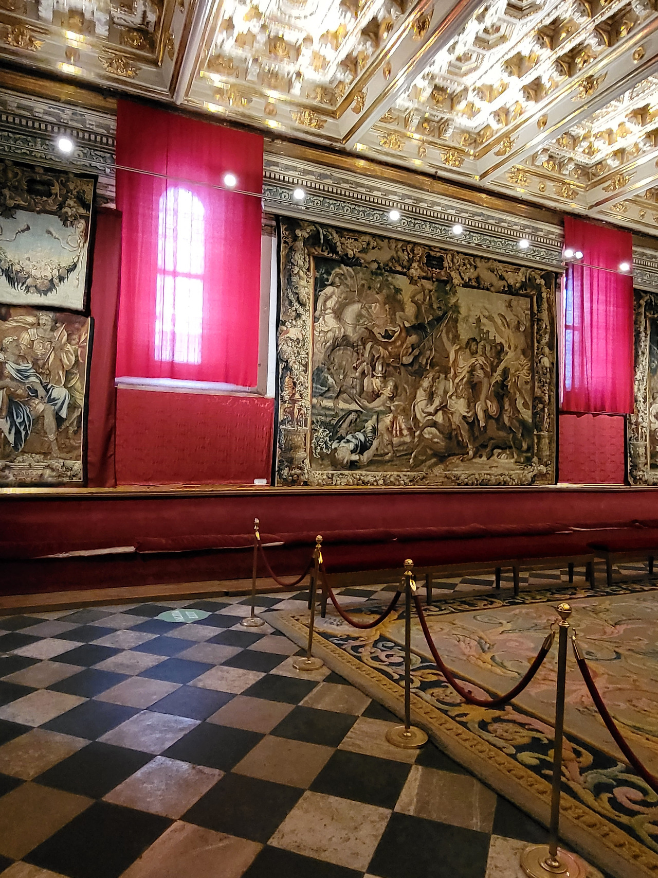 태피스트리들을 보호하기 위해 창문엔 붉은 천이 드리워져 있고 붉은 벨벳 의자들이 극장처럼 길게 늘어서 있어요.