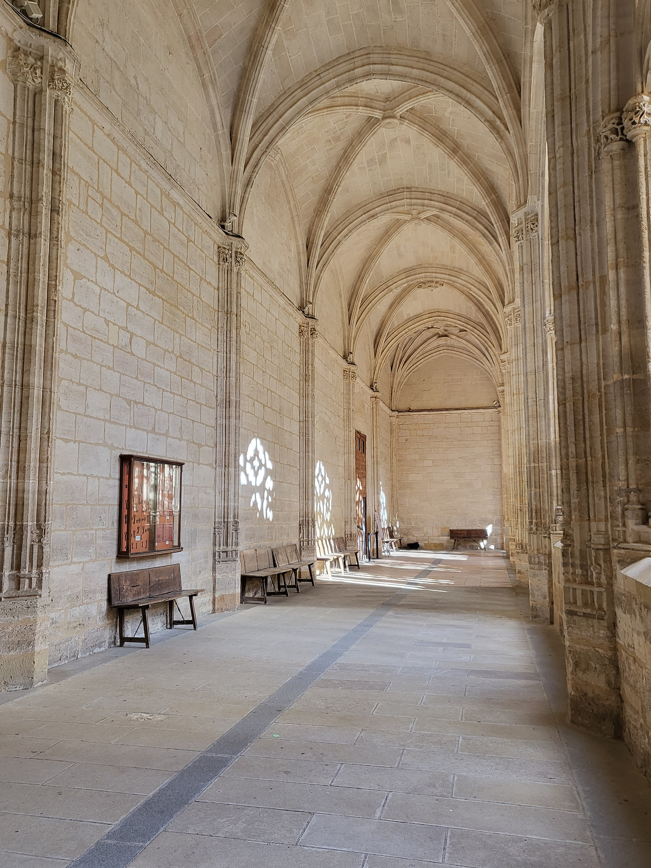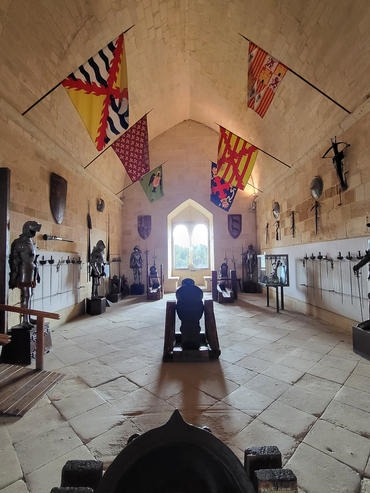 천장에는 별처럼 흩어진 문양이 박혀 있고 그 아래에는 묵직한 태피스트리들이 조용히 시간을 걸치고 있습니다.