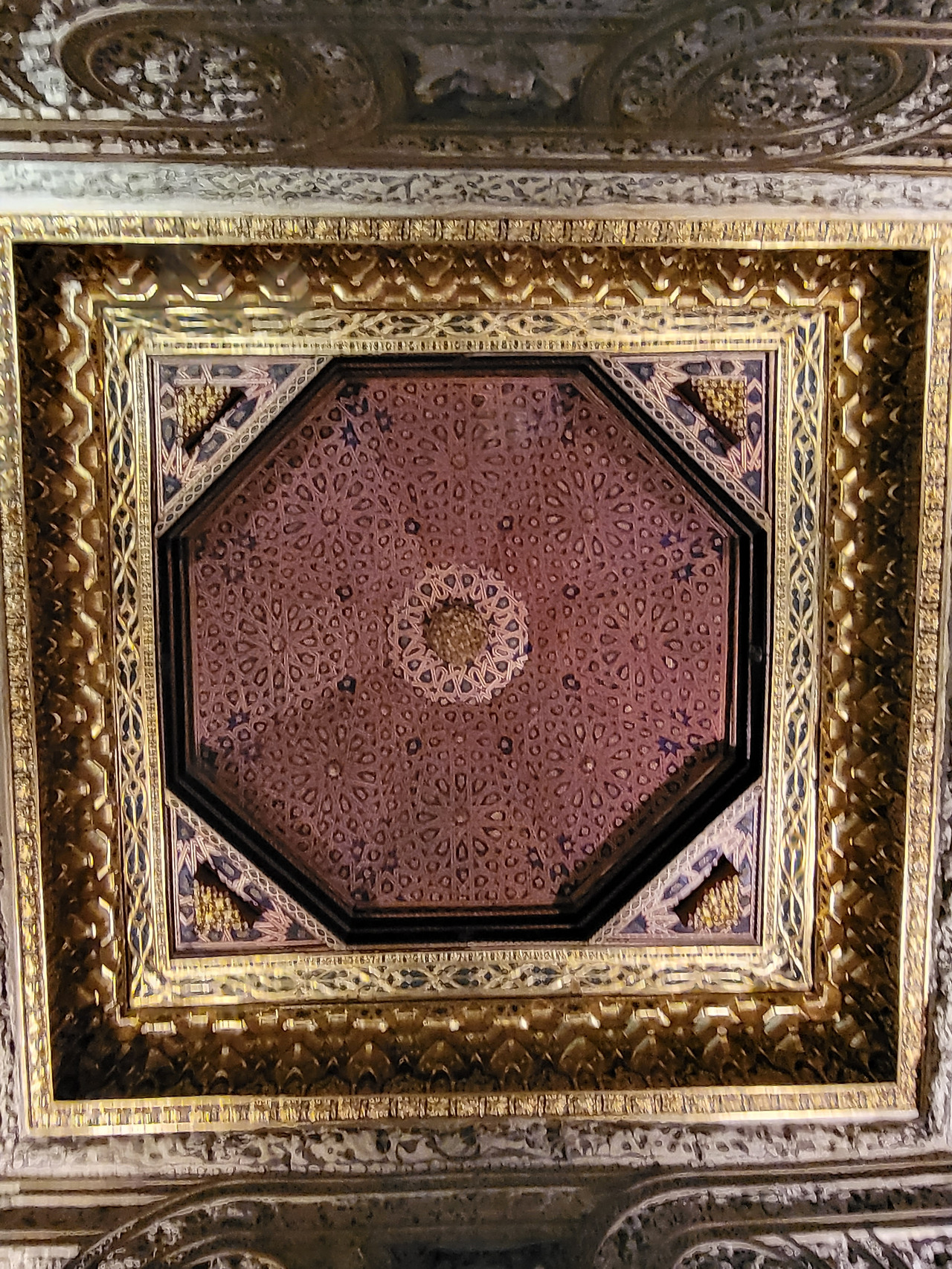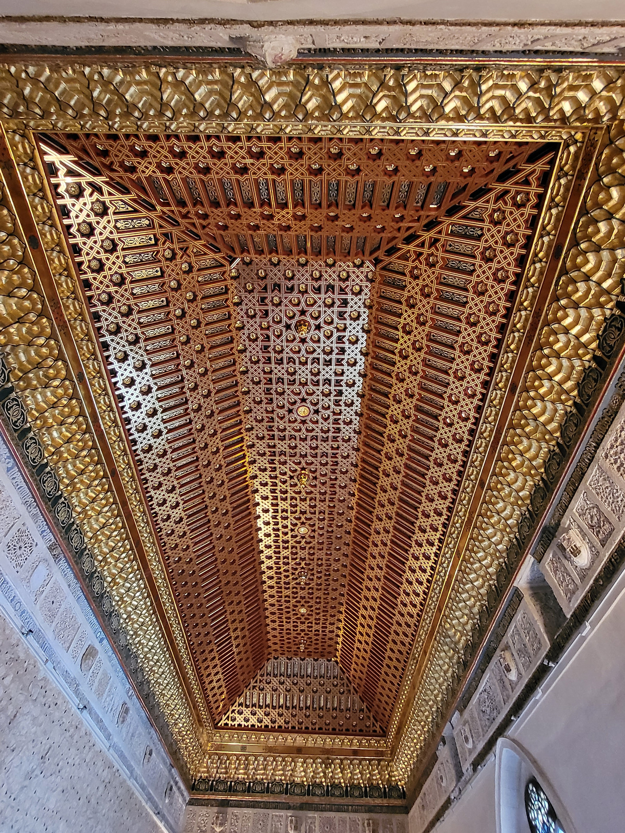 나무로 정교하게 조각된 천장에는 별 모양 패턴이 겹겹이 이어지고, 그 아래 벽면을 따라 아라베스크 문양이 유려합니다.