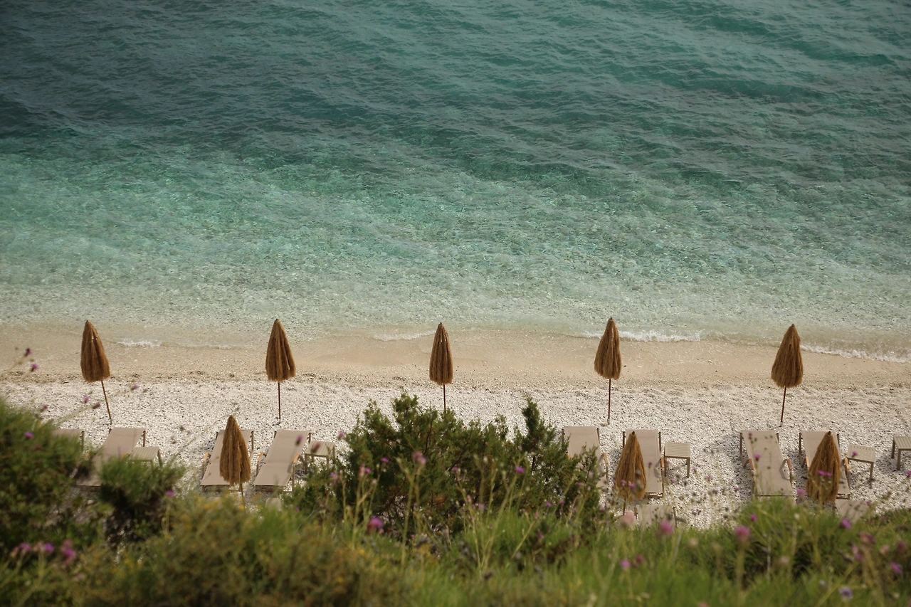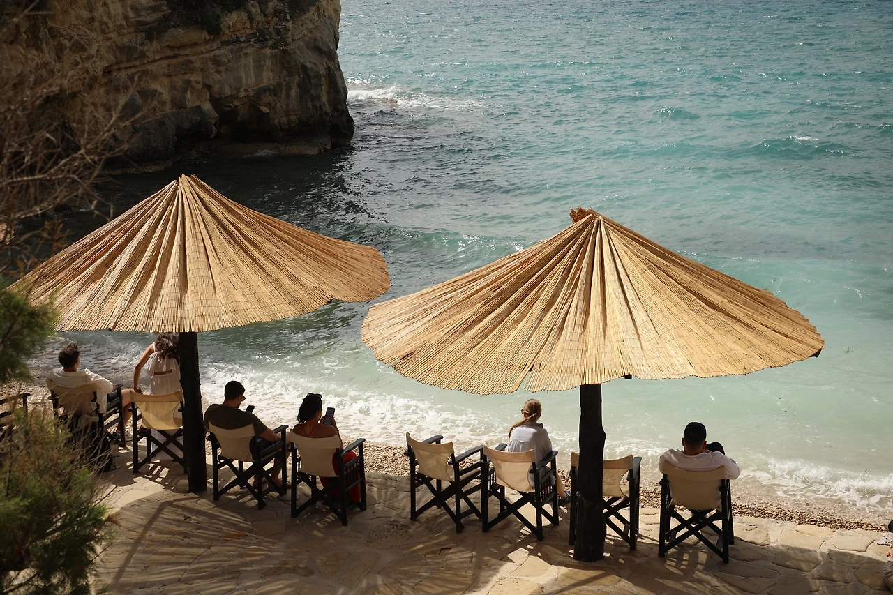 아래를 내려다보니 작은 해변에 짚으로 만든 파라솔이 접힌 채 한가로이 서있습니다.