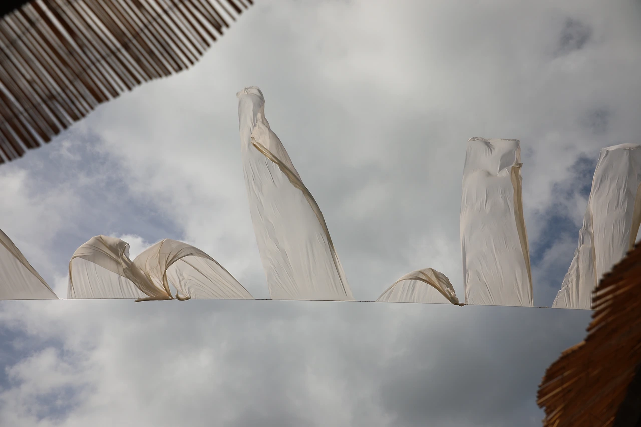 하얗고 긴 천들이 바람에 나부낍니다.