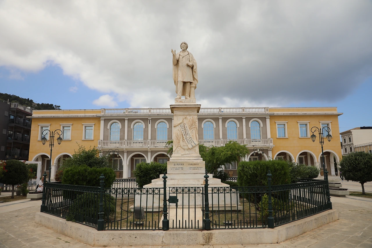 광장에는 그리스의 작사자, 자킨토스 출신 시인인 디오니시오스 솔로모스(1798-1857) 동상이 서 있습니다.