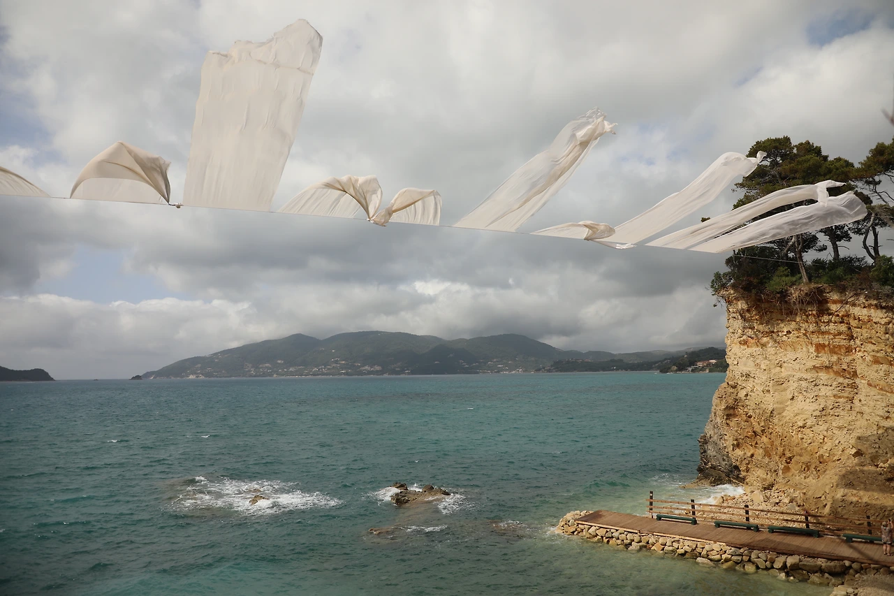 나부끼는 하얀 천 아래, 바다를 배경으로 서서요.
