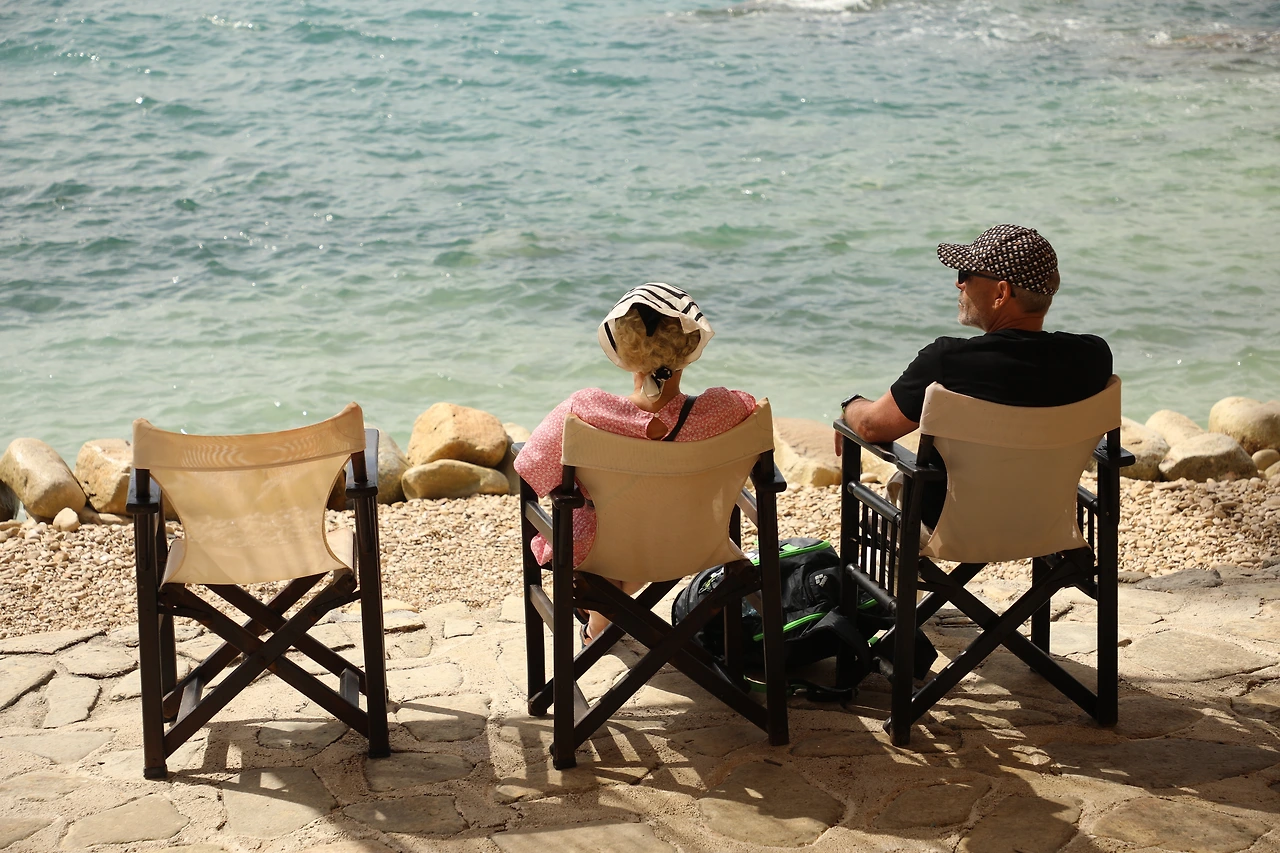 야트막한 해변 앞에 놓인 나무 의자에 앉아 바람을 맞습니다.