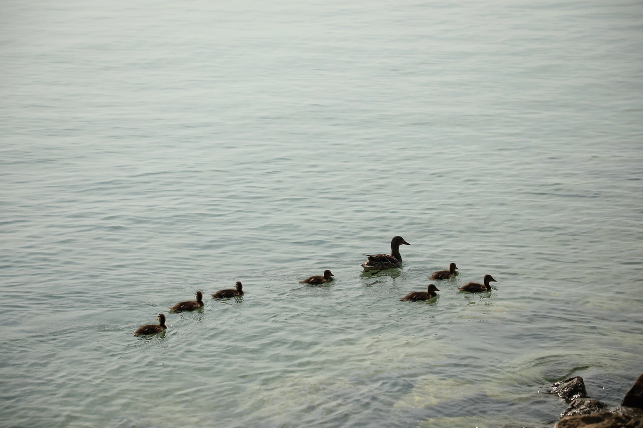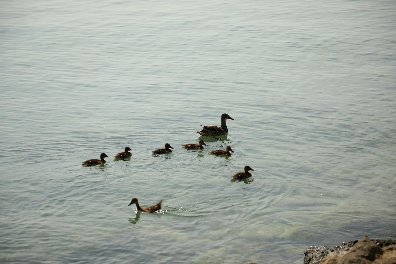 일곱 마리 아기 오리들이 착하게 엄마 오리를 줄줄이 따르고 있다.