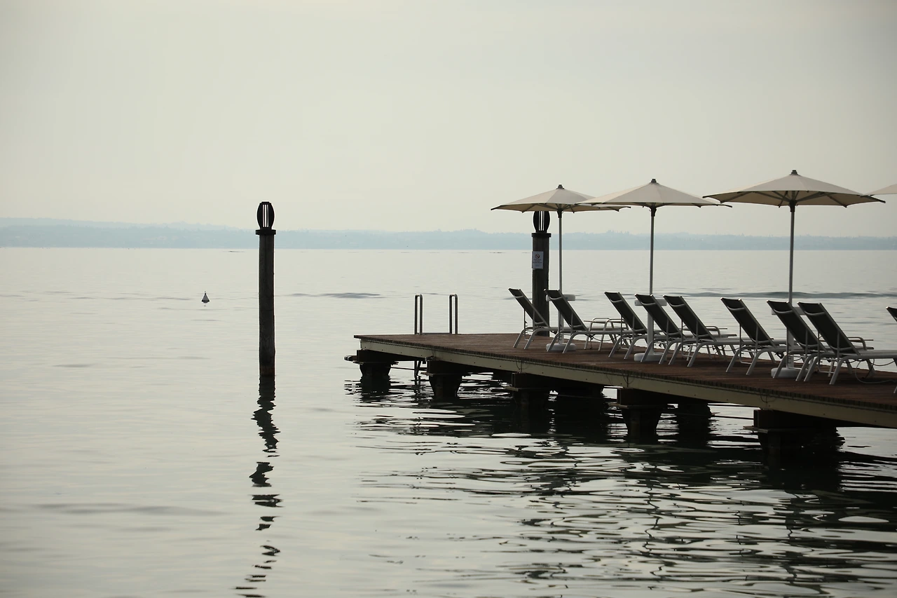 이른 아침 가르다 호수, 물빛은 고요하고, 하늘이 낮다.