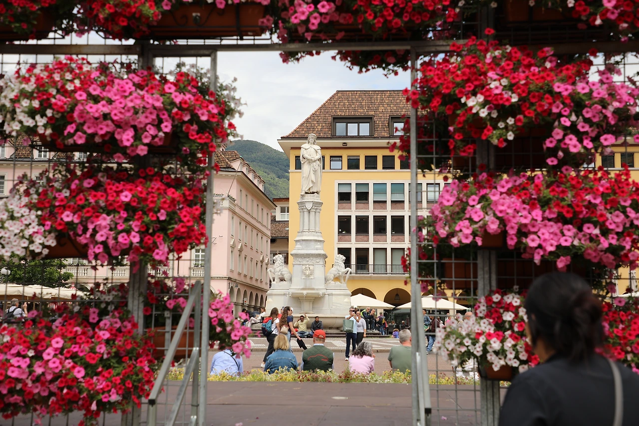 광장에는 카페, 꽃으로 만든 탑, 행복해 보이는 사람들이 모여 알프스 햇살을 품고 있었습니다.