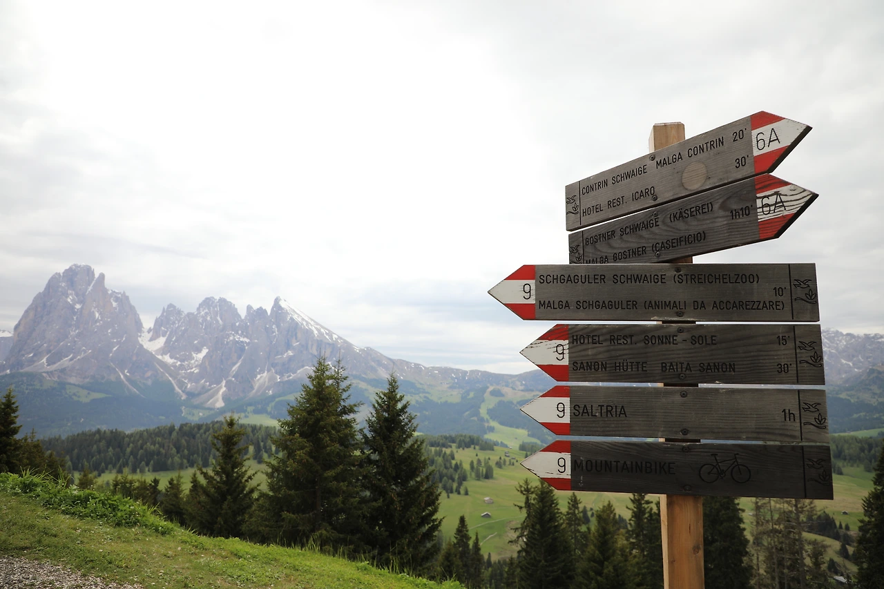 오르티세이의 호텔들이 모여있는 중심가를 지나 다리를 건너면 라딘어(이탈리아 북부에 사는 라딘 민족이 사용하던 언어)로 몬 세우크(Momt seuc)라는 표지가 보입니다.