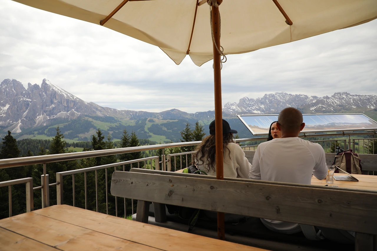 로칸다 알핀 몬 세우크라는 이름의 산장 레스토랑의 테라스에 앉았습니다.
