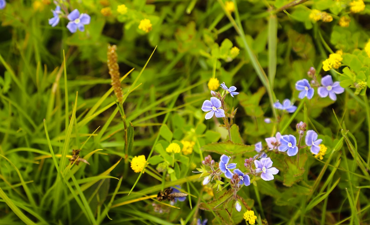 손톱보다 작은 노란 꽃, 쌀 한 톨만 한 꽃잎들이 조랑조랑 달린 보라색 꽃들이 누구에게도 들키지 않으려는 듯 낮은 자세로 피어 있었거든요.