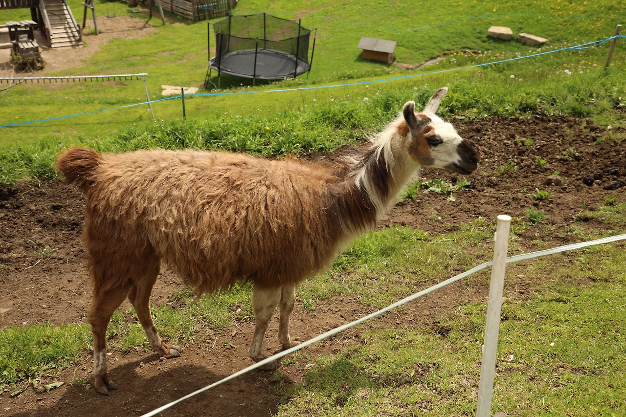 낮은 울타리 안, 조용히 바라보는 알파카 한 마리와 마주쳤습니다.