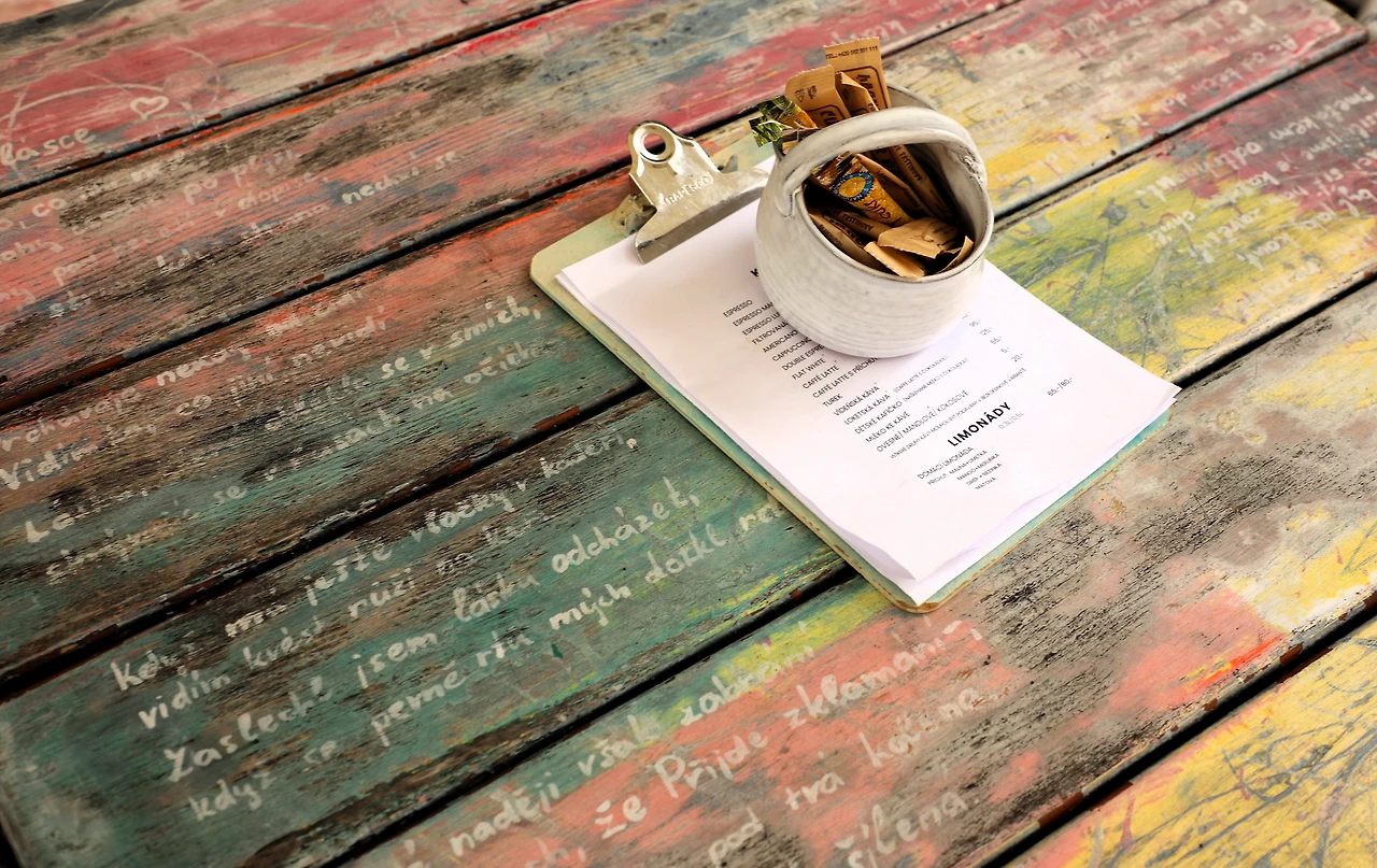낡은 목재 테이블 사이로 주고받는 짧은 인사,
