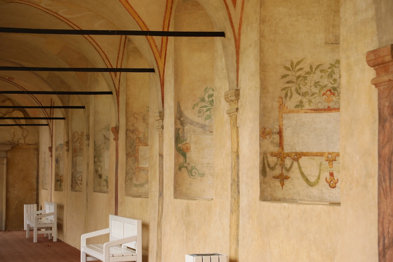 회랑의 몰딩 틈새, 몇 세기 전 장인이 새긴 덩굴 문양이 은은하게 빛납니다.
