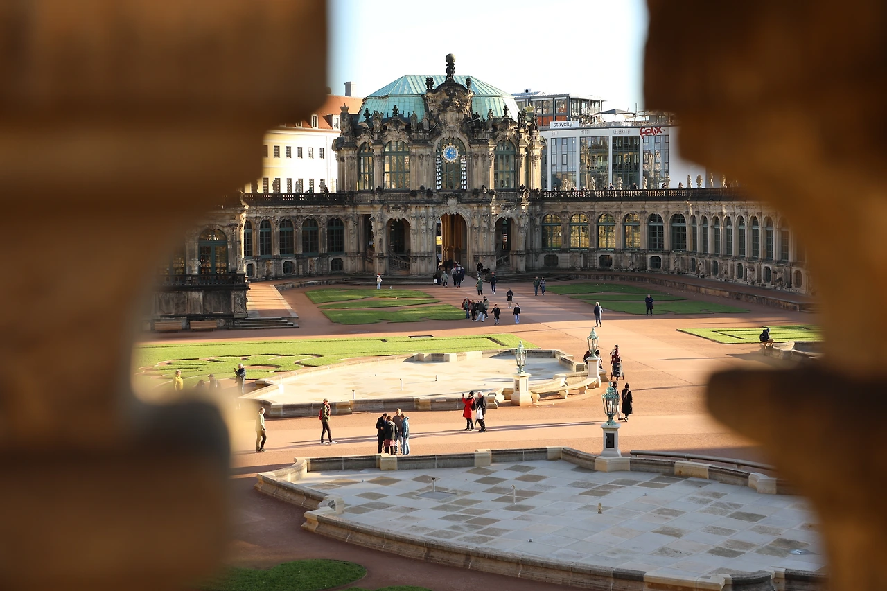 다리 끝에 다다르자 멀리 츠빙거 궁전의 회색빛 돔과, 젬퍼 오페라의 유려한 선들이 서서히 윤곽을 드러냈습니다.