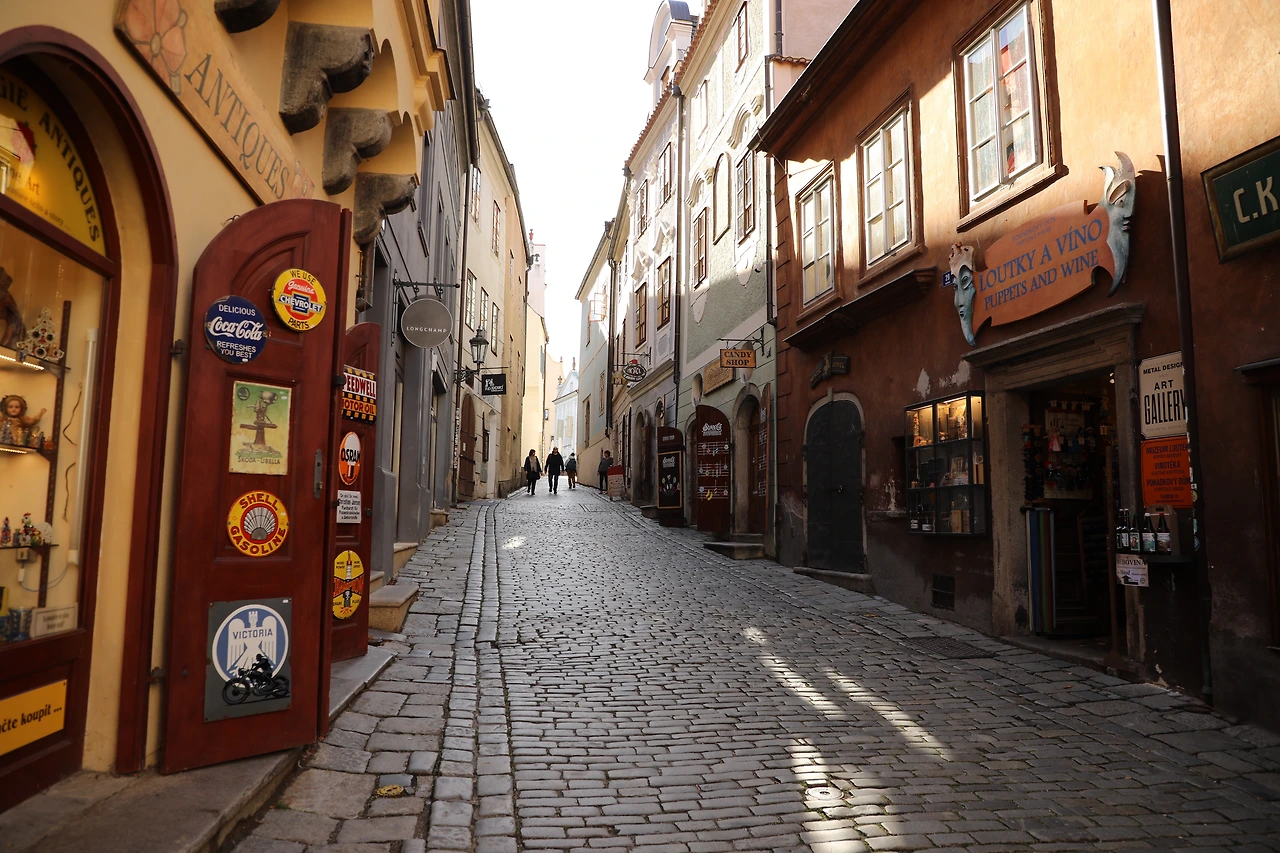 블타바강을 따라 걷다 보면 붉은 지붕 아래 이끼 낀 벽, 창틀에 기대 졸고 있는 고양이, 바람에 흔들리는 간판이 소소하게 보입니다.