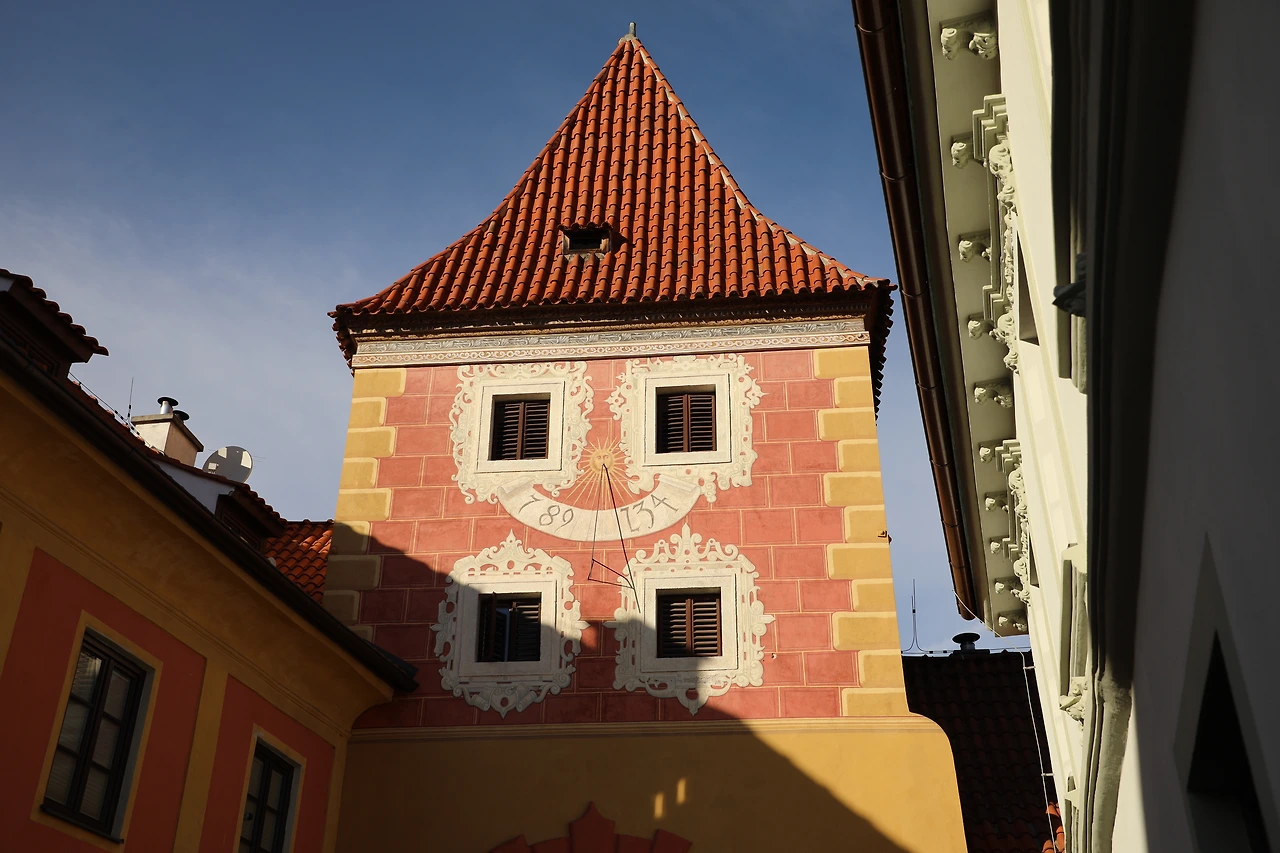 부데요비체 성문의 노란 해시계에 오후의 금빛이 얇게 내려앉아 있습니다.