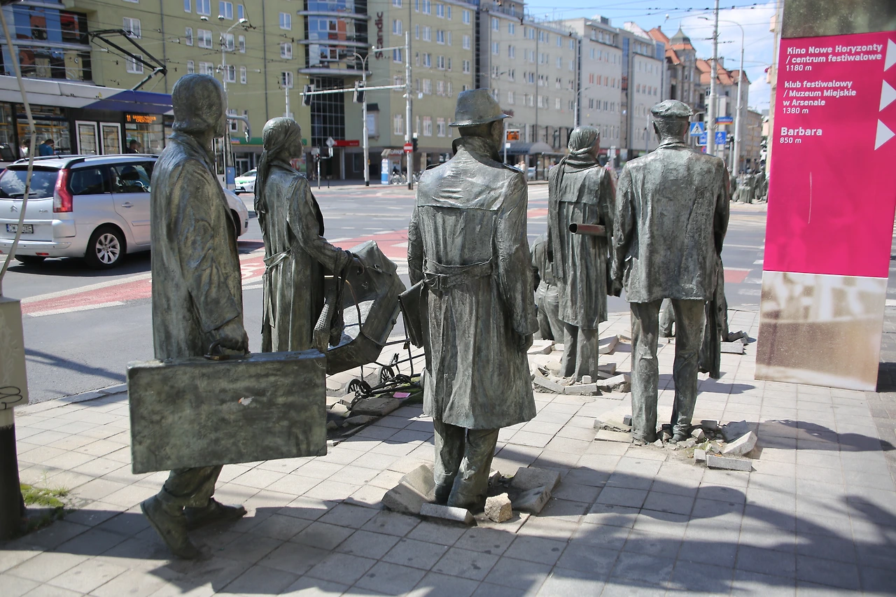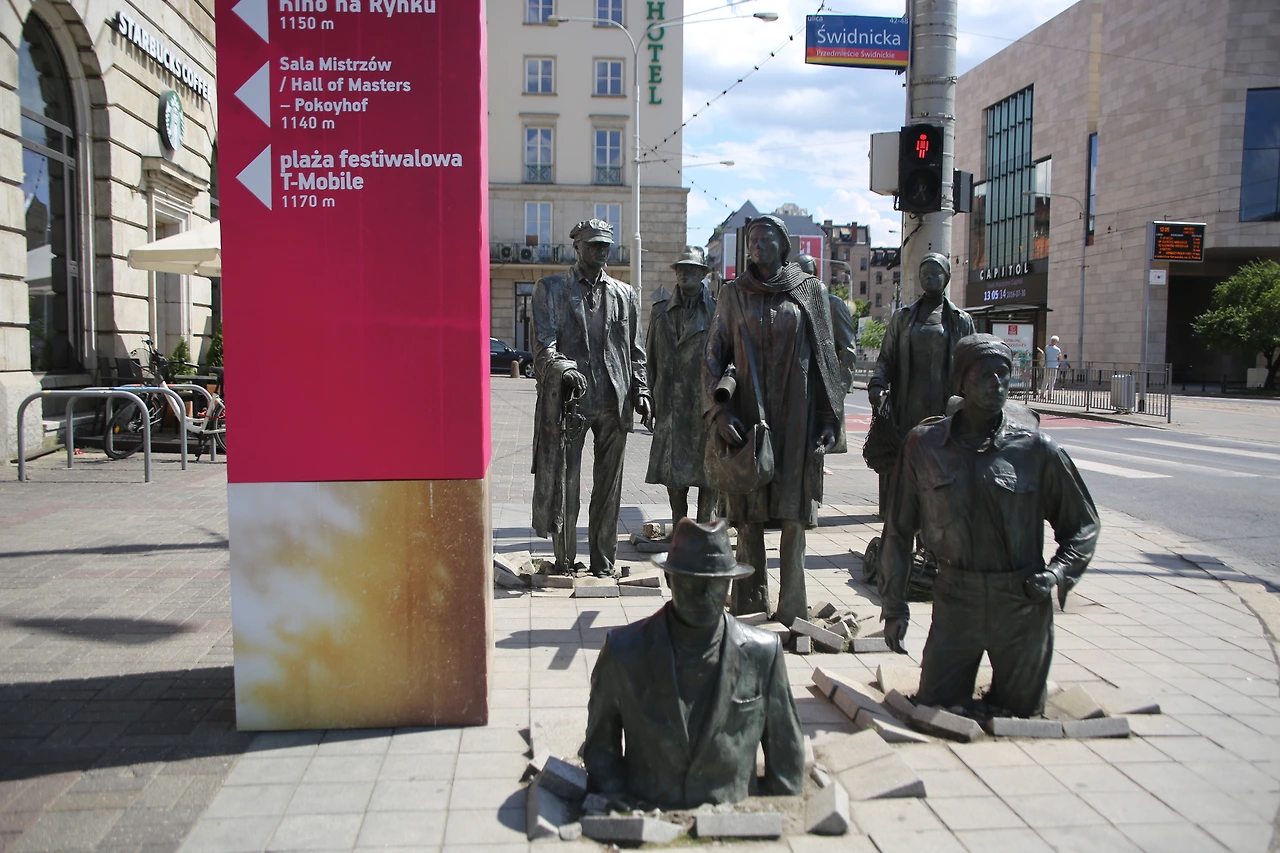 호텔을 나와 오른쪽으로 100m쯤 갔을 때 충격적인 장면이 눈앞에 떡~ 하니 펼쳐졌다. 시멘트 가루를 뒤집어쓴 듯 회색이 도는 청동 빛 사람들이 땅 속으로 걸어 들어가고 있다. 길 건너편의 사람들은 이쪽과 반대로 땅속에서 걸어 나온다. 브로츠와프에는 난쟁이 동상이 많다는 건 알고 있었다. 그러나 그것들은 일반적인 사람과 똑같은 크기였다. 그러니 분명 난쟁이는 아니다. 그로테스크한 느낌이 들면서 섬뜩했다.