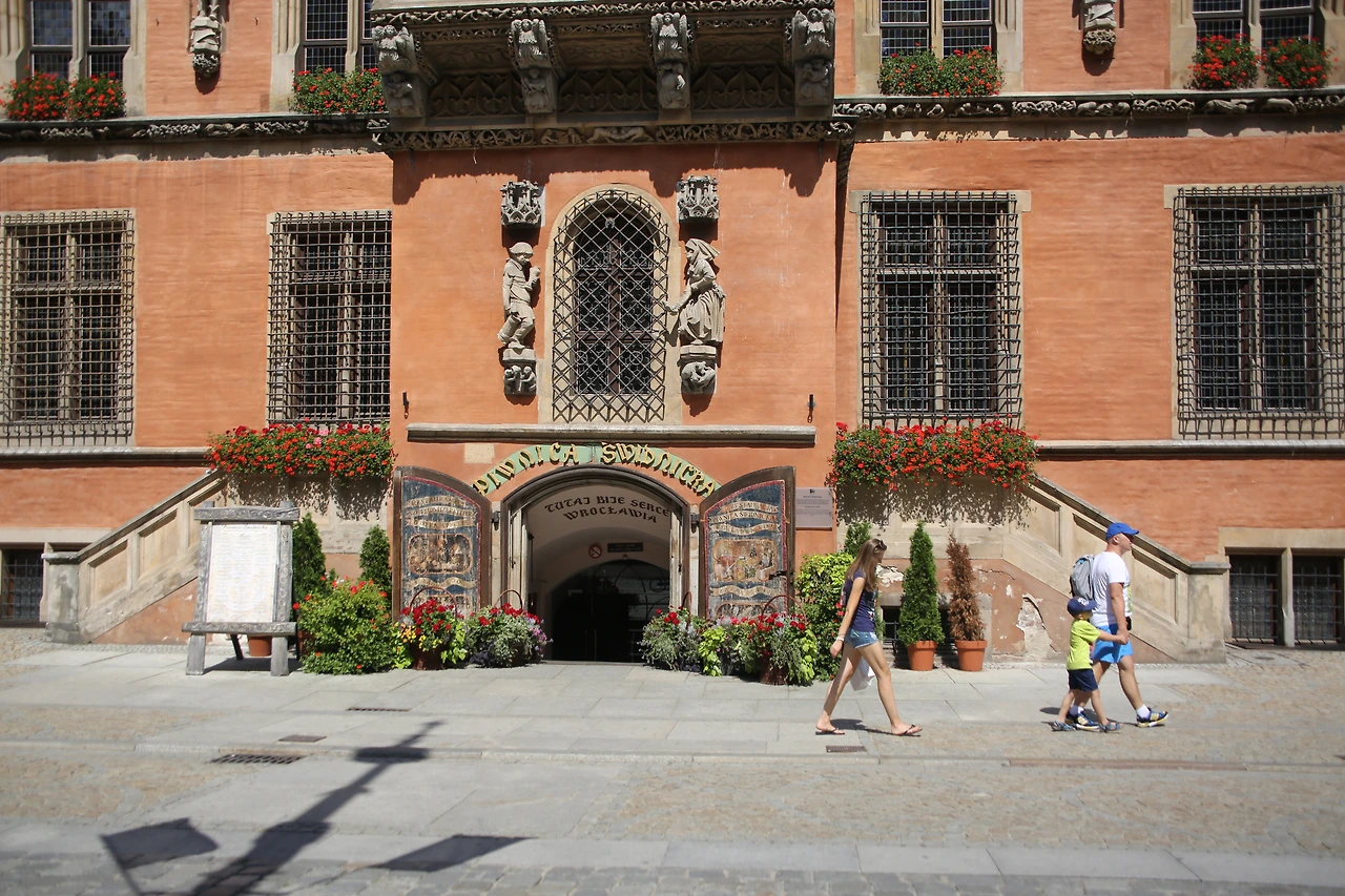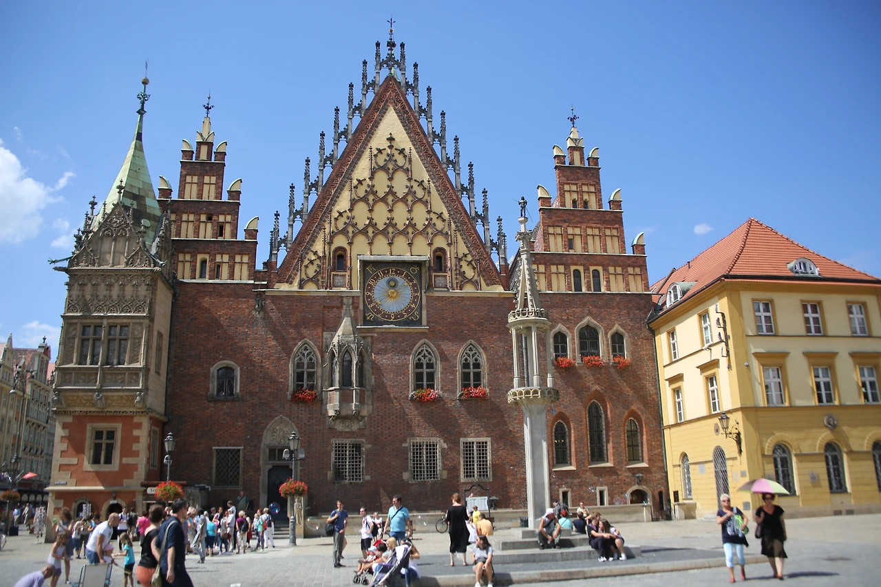 거리 곳곳에서 심심찮게 나타나는 난쟁이들의 사진을 찍다 보니 리넥(Rynek)에 도착했다. 리넥은 폴란드어로 광장이나 시장을 칭하는 말이다. 구시가지로 들어서며 맨 처음 눈을 사로잡은 것은 브로츠와프 시청이다. 건물 전면의 화려한 건축 양식과 컬러를 보고 깜짝 놀랐다. 1290년에 시작해서 증개축을 거듭해 250년 만에 완성했는데 고딕과 르네상스 양식을 함께 지닌 건축물이다. 다행히 제2차 세계대전 때 큰 피해를 입지 않아 고스란히 남아있다.