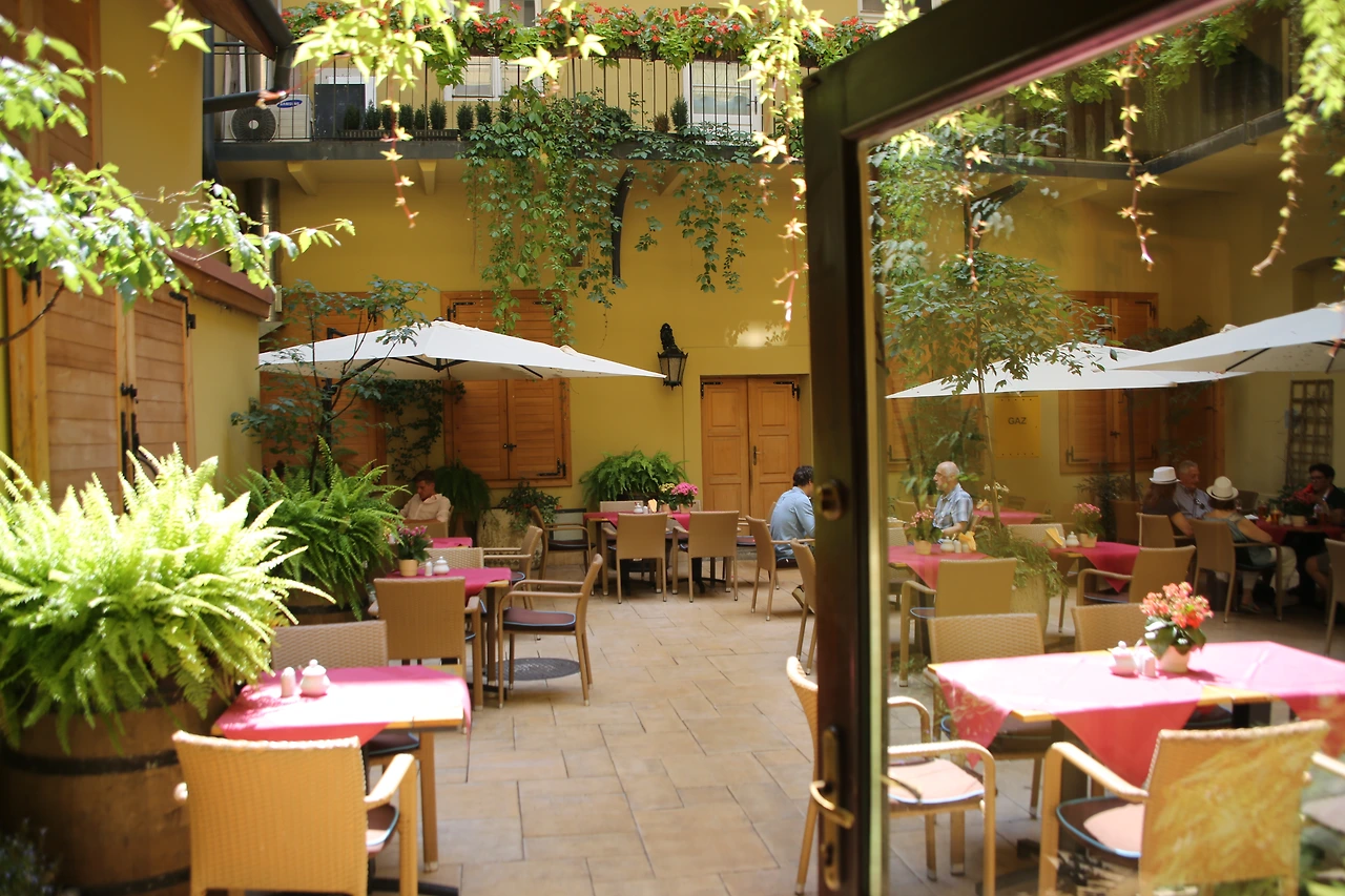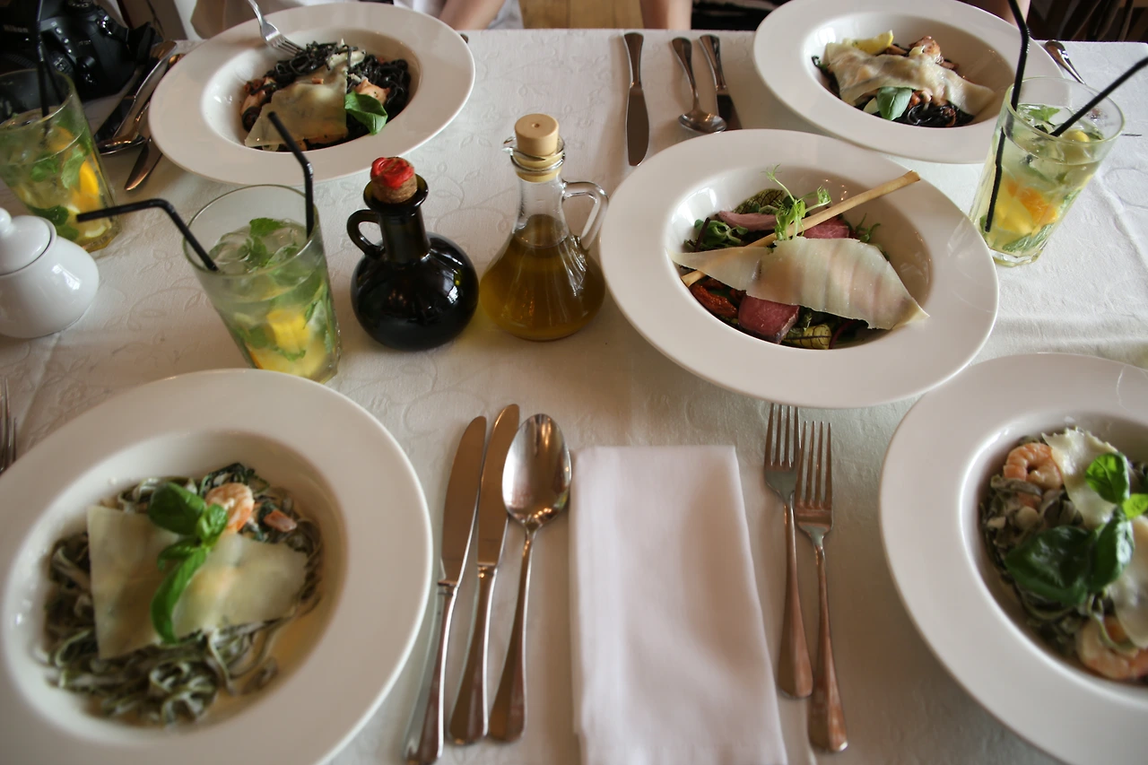 그가 추천해준 레스토랑을 찾아갔다. 공원을 가로지르니 바로 올드 타운이다. Miod marina는 인테리어가 럭셔리하고 고급스러운 레스토랑이었다. 음식점 안쪽 중정에는 레몬 컬러의 벽과 상반된 핑크 색의 테이블보의 매칭이 싱그럽다. 2층 테라스에서 늘어뜨려진 녹색 식물들이 햇빛을 받아 반짝이고 있다. 내부의 중앙 등은 그레이 빛 나무 구슬이 늘어진 끝에 오렌지 빛 전등갓이 씌워져 있고 아치형 천장엔 고대 그리스 벽화처럼 포도송이가 그려져 있다. 매끄럽게 다림질된 하얀 린넨 커튼이 정갈하게 창문을 덮고 있어서 깔끔하다.