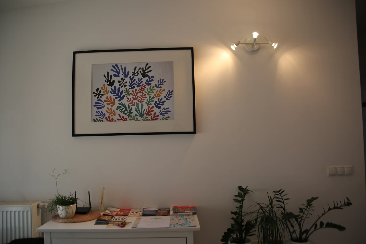 비가 오락가락해서 일단 아파트로 돌아갔다. 체크인할 때 아직 청소 중이라고 해서 들어가 보지 못했었다. 이박삼일 동안 짧게 머무를 곳이지만 그래도 언제나 숙소는 궁금하다. 나무계단이 무척 아름다웠다. 윤기가 돌만큼 반질반질하게 질이 잘 난 계단은 맨발로 다녀도 될 만큼 깨끗했다. 현관에 들어서니 선반에 게스트용 우산이 걸려있다. 거실 한 켠 서랍 장위엔 여행 가이드 책자와 펜, 그리고 깜찍한 화분이 놓여있다. 하얀 벽엔 마티스의 색종이 시리즈 그림액자가 걸려있고 하얀 식탁엔 빨간색 식탁 러너가 깔려있다. 카키색 소파 위엔 푹신한 린넨 쿠션이 놓여있고 거실보다 높이를 다르게 만든 공간엔 아이들을 위한 침대와 장난감, 그림을 그릴 수 있는 칠판이 놓여 있다.